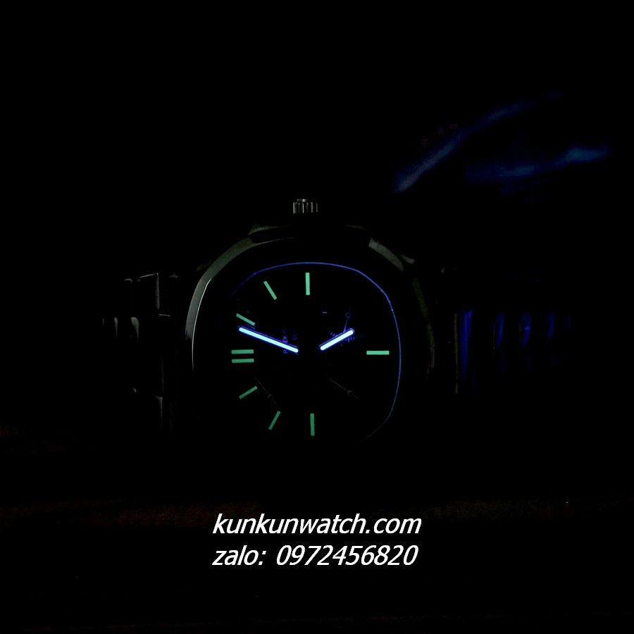 Đồng Hồ Nam Patek Philippe Nautilus có nền mặt vân với 3 mặt số phụ thể hiện mức năng lượng, lịch ngày, lịch trăng sao, kim nhỏ chạy giây. Dây đeo thép không rỉ mạ PVD cực bền màu