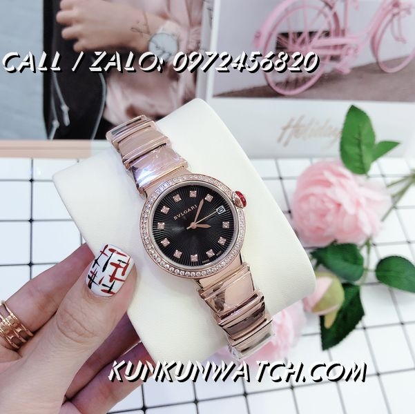 Đồng Hồ Nữ Bvlgari BGRNT03 - đính hạt quanh mặt và tại các cột mốc giờ - núm chỉnh giờ to - dây đeo kiểu dáng cách điệu - lịch ngày vị trí 3H.