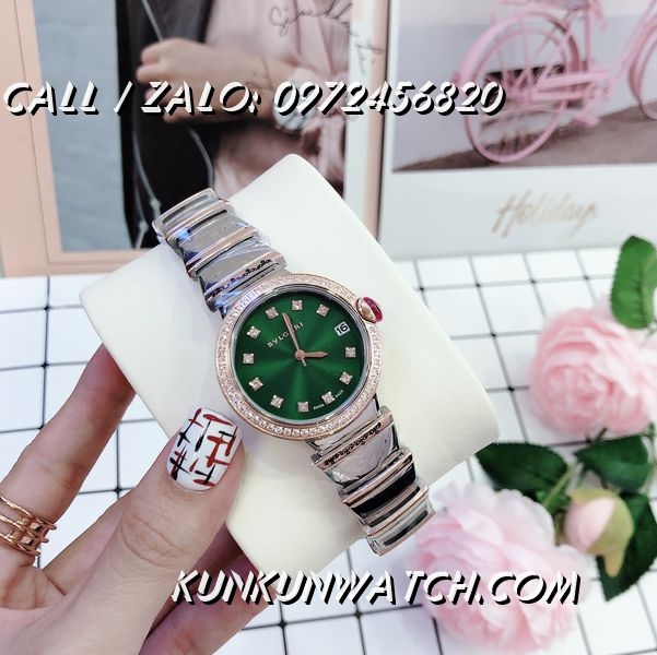 Đồng Hồ Nữ Bvlgari BGRNT06 - đính hạt quanh mặt và tại các cột mốc giờ - núm chỉnh giờ to - dây đeo kiểu dáng cách điệu - lịch ngày vị trí 3H.