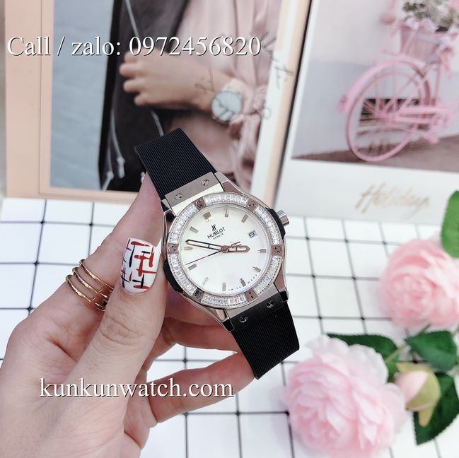Đồng Hồ Nữ Hublot HLNSV011 - mặt số đính viền đá vuông - dây đeo cao su đặc trưng - 3 kim hoạt động - cửa sổ lịch ngày vị trí 3H.