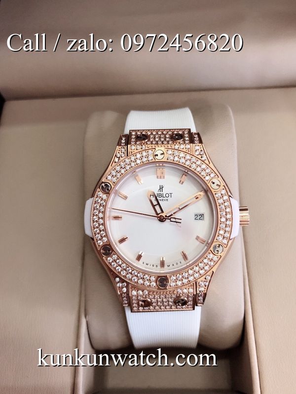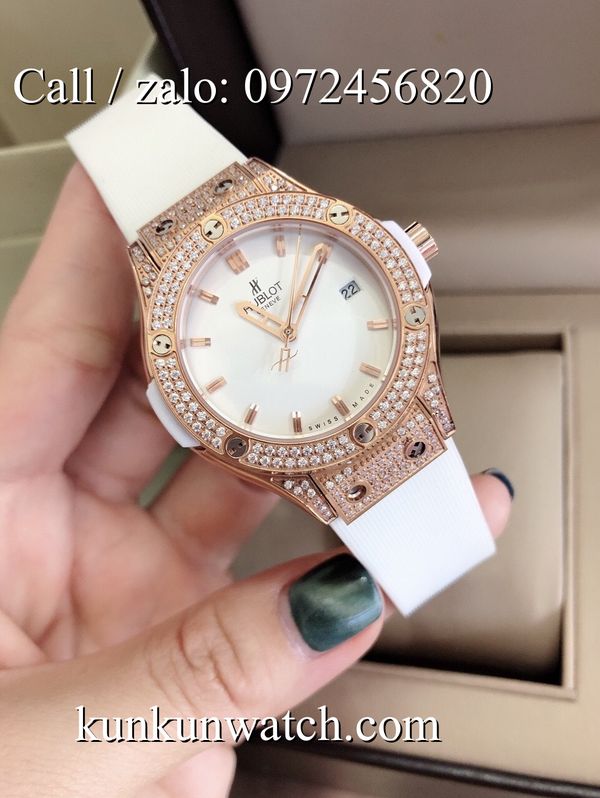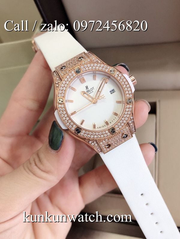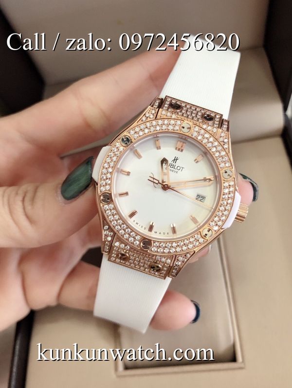 Đồng Hồ Nữ Hublot HLNSR026 - mặt số và vỏ được đính viền đá nổi bật - dây đeo cao su đặc trưng - 3 kim hoạt động - cửa sổ lịch ngày vị trí 3H.