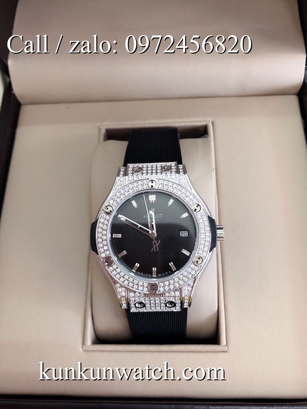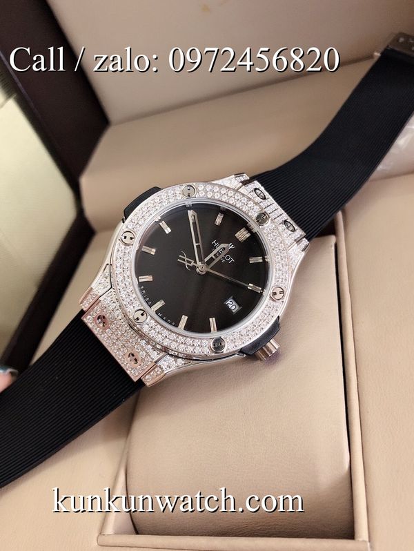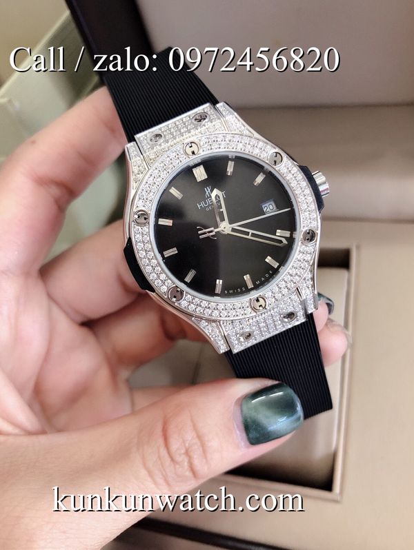Đồng Hồ Nữ Hublot HLNSR021 - mặt số và vỏ được đính viền đá nổi bật - dây đeo cao su đặc trưng - 3 kim hoạt động - cửa sổ lịch ngày vị trí 3H.