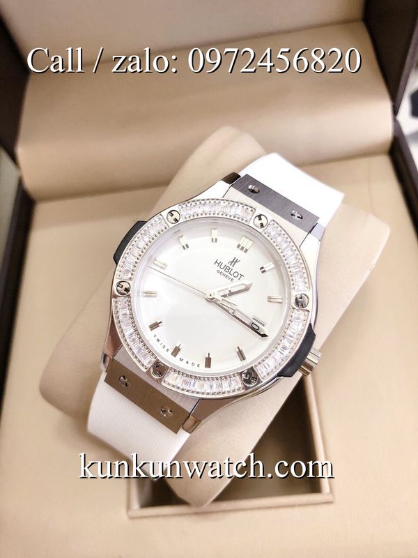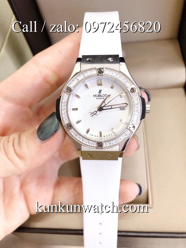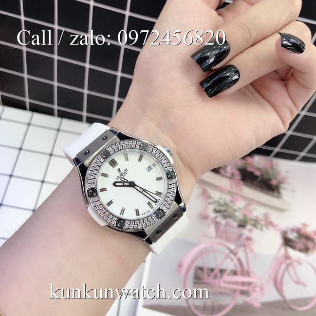 Đồng Hồ Nữ Hublot HLNSV017 - mặt số đính viền đá vuông - dây đeo cao su đặc trưng - 3 kim hoạt động - cửa sổ lịch ngày vị trí 3H.