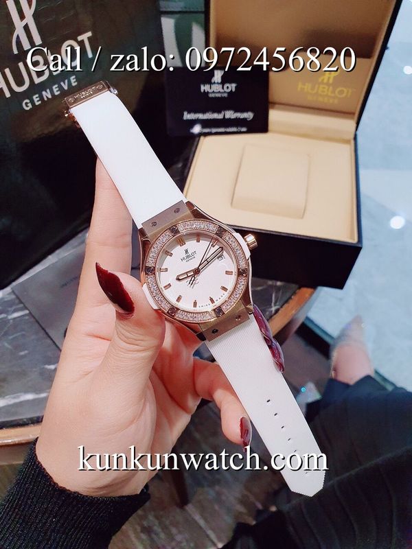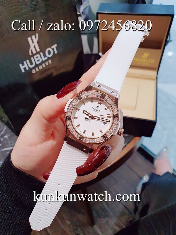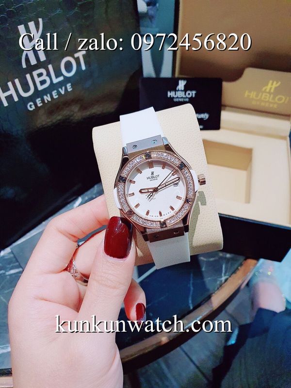 Đồng Hồ Nữ Hublot HLNSV018 - mặt số đính viền đá vuông - dây đeo cao su đặc trưng - 3 kim hoạt động - cửa sổ lịch ngày vị trí 3H.