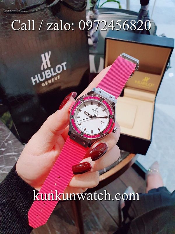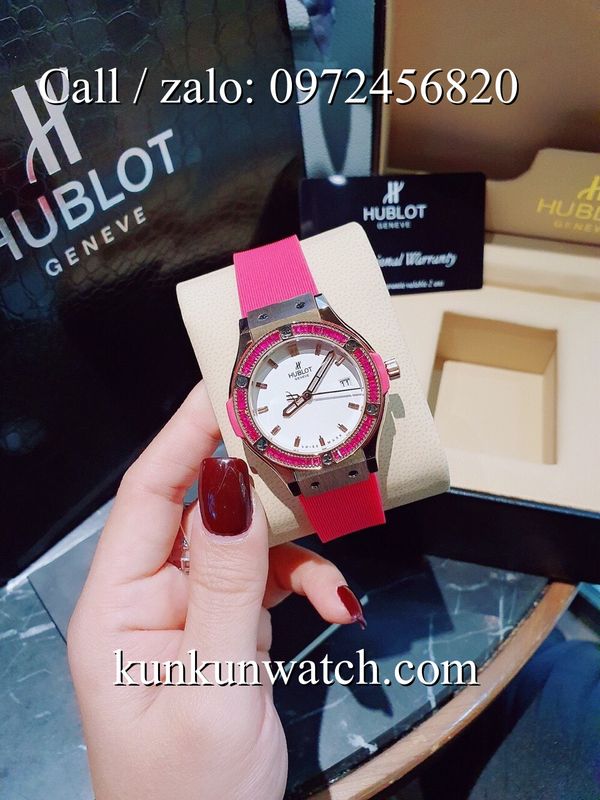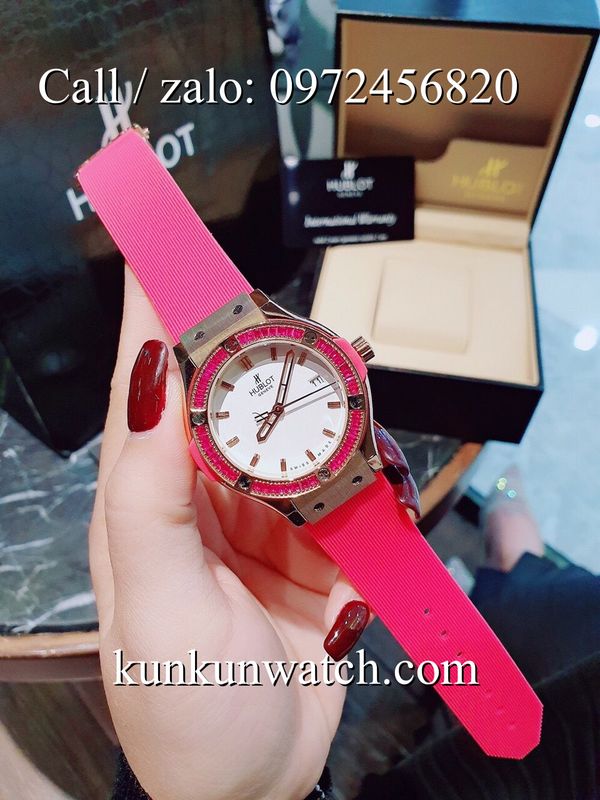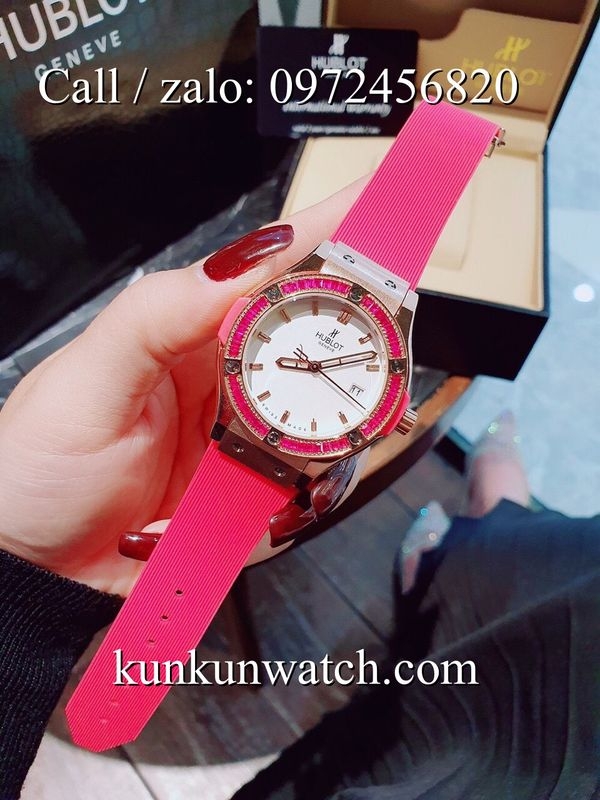 Đồng Hồ Nữ Hublot HLNSV0191 - mặt số đính viền đá vuông - dây đeo cao su đặc trưng - 3 kim hoạt động - cửa sổ lịch ngày vị trí 3H.