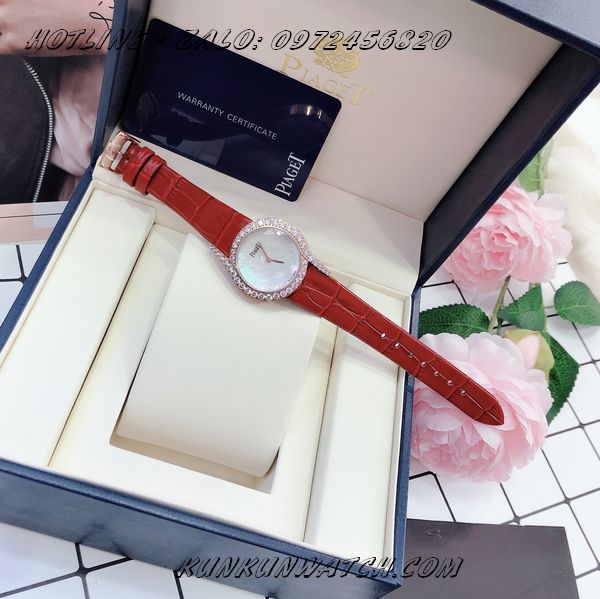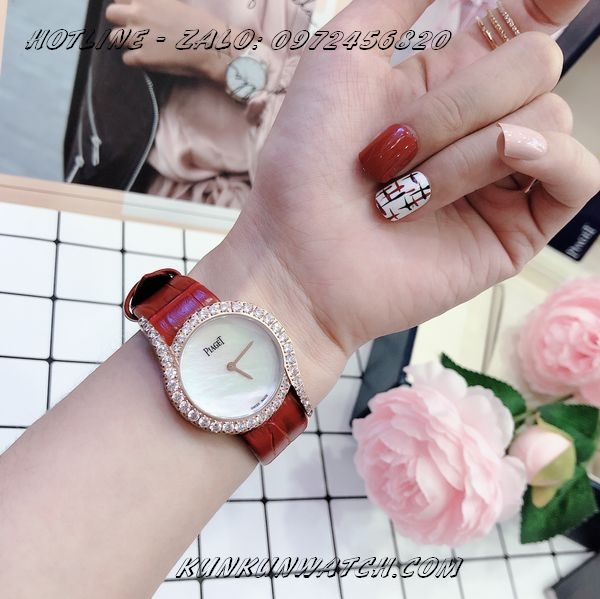 Đồng Hồ Nữ Piaget PGND032 - đính hạt phá cách quanh mặt và 1 phần dây đeo - chỉ có 2 kim chỉ giờ và phút đơn giản - dây da kiểu dáng vân sang trọng.