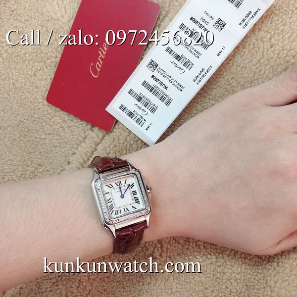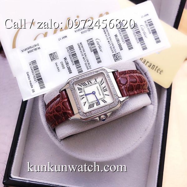 Đồng Hồ Nữ Cartier Montre Ballon CTEND022 - mặt số vuông case 26 x 28mm được đính viền hạt nổi bật - vạch số la mã chỉ giờ cổ điển - 2 kim chạy - dây đeo bằng da cá sấu cao cấp, sang trọng, thanh lịch.