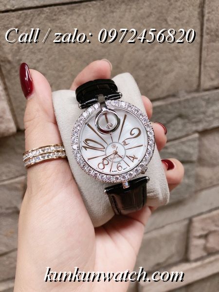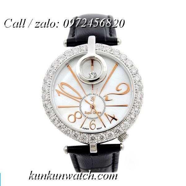 Đồng Hồ Nữ Royal Crown 3850 đính đá swarovski quanh viền mặt số và tại vị trí 12H nổi bật và cá tính - các số chỉ giờ được cách điệu - núm chỉnh giờ lệch phía dưới phá cách.