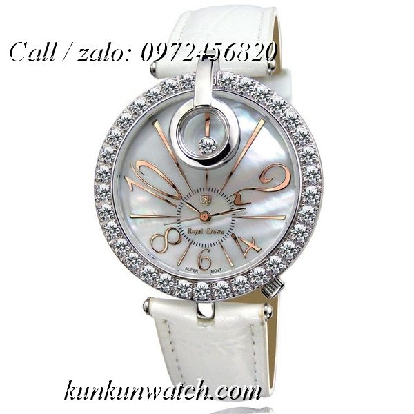 Đồng Hồ Nữ Royal Crown 3850 đính đá swarovski quanh viền mặt số và tại vị trí 12H nổi bật và cá tính - các số chỉ giờ được cách điệu - núm chỉnh giờ lệch phía dưới phá cách.