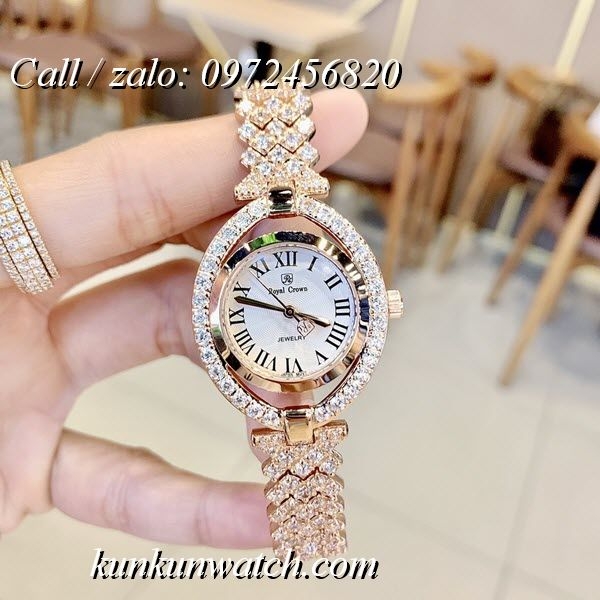 Đồng Hồ Nữ Royal Crown 4610 có mặt số tương đương 32mm - sử dụng số la mã chỉ giờ cổ điển - vỏ và dây full hạt nổi bật, sang trọng.