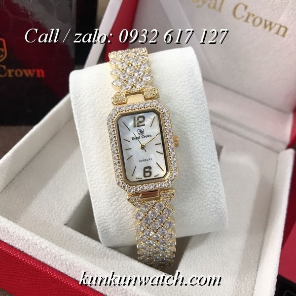 Đồng Hồ Nữ Royal Crown 6316 - mặt số chữ nhật nhỏ nhắn - đánh số chỉ giờ tại vị trí 6H và 12H - vỏ và dây full hạt nữ tính, sang trọng.
