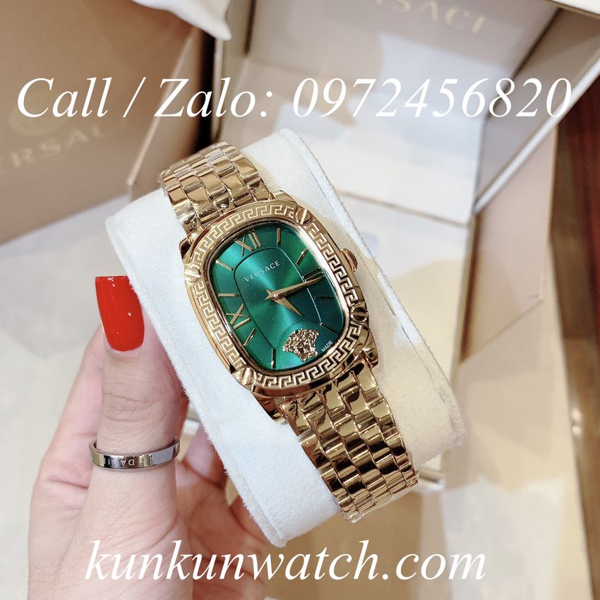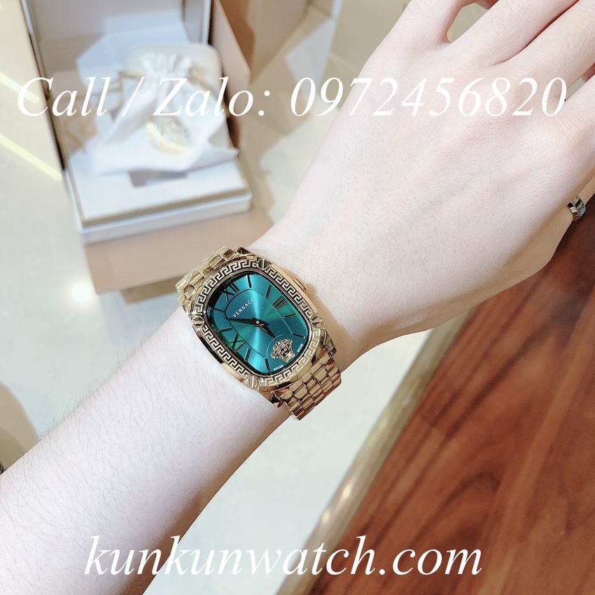 Đồng Hồ Nữ Versace Couture điểm số la mã tại các mốc 3, 9 và 12H kết hợp logo Medusa nổi vị trí 6H, 2 kim giờ và phút, nền mặt xanh mộc