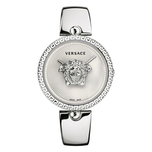 Đồng Hồ Nữ Versace Palazzo Empire có thiết kế độc đáo với logo Medusa to ngay vị trí trung tâm mặt số cùng tên thương hiệu trên nền mặt số tia, 2 kim chạy