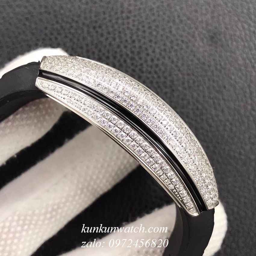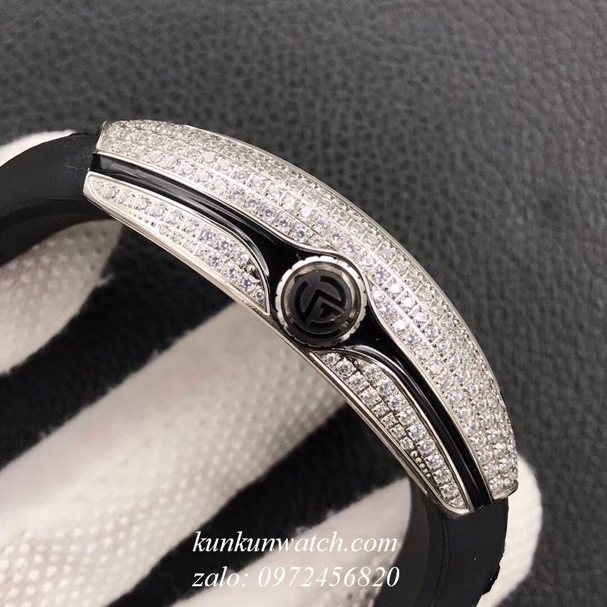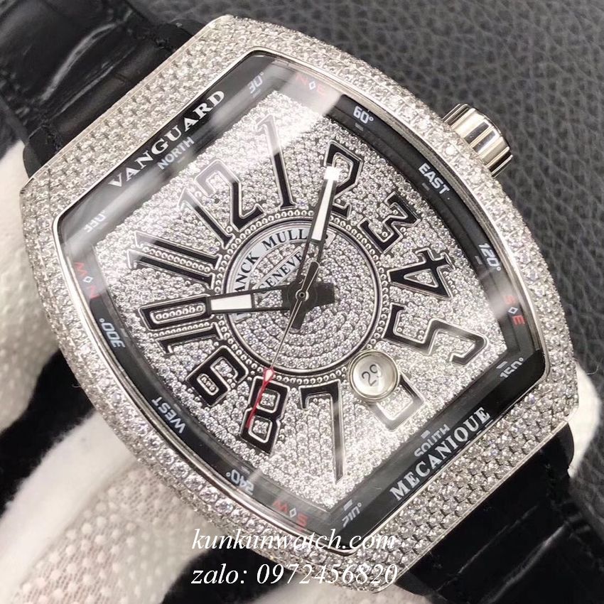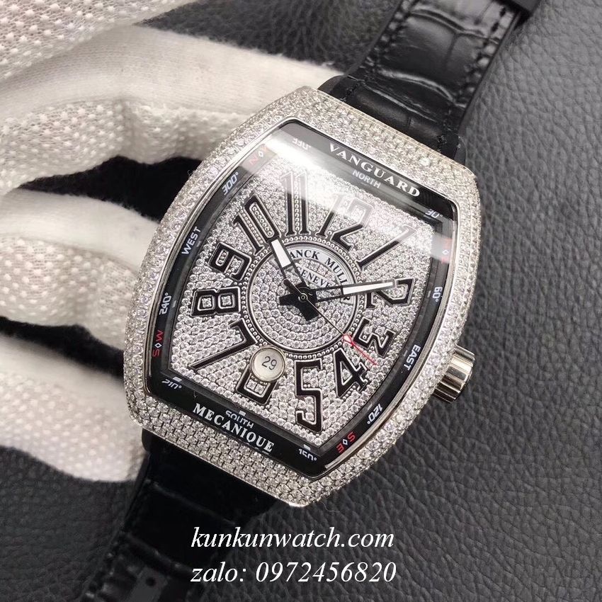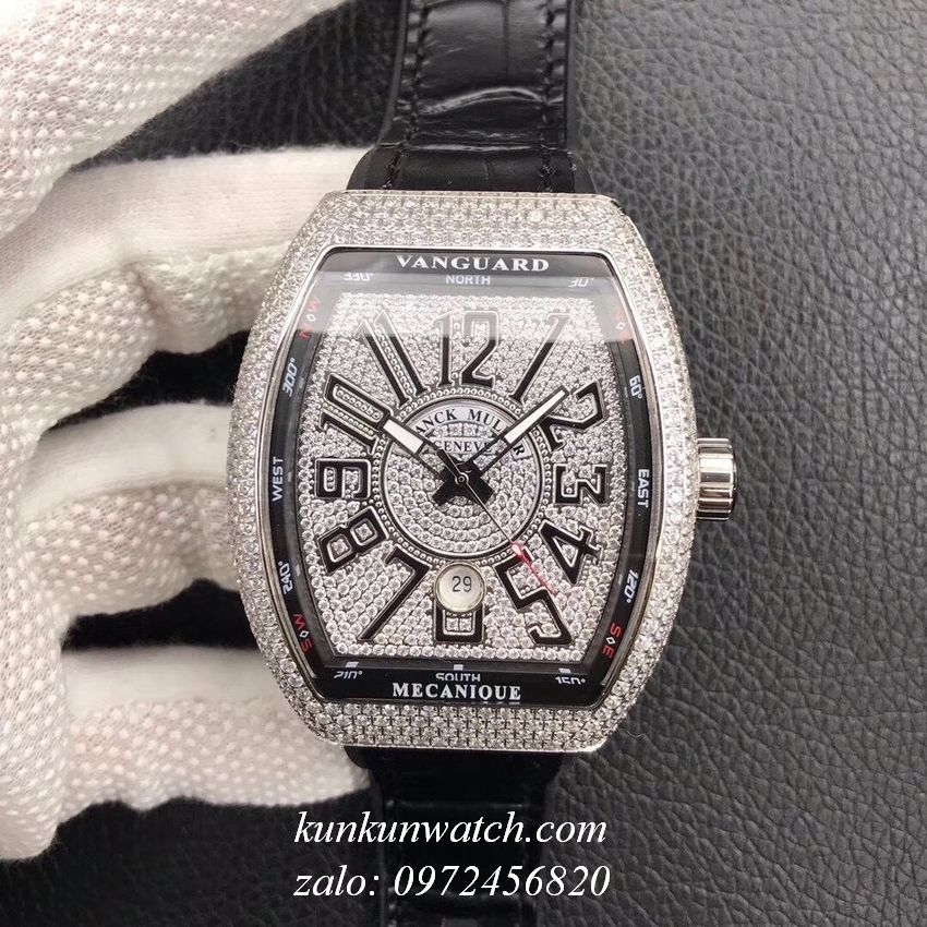 Đồng Hồ Nam Franck Muller đính Full đá ở vỏ ( silver ) và nền mặt số sang trọng, cá tính. Điểm số giờ phá cách. Lịch ngày mốc 6 giờ
