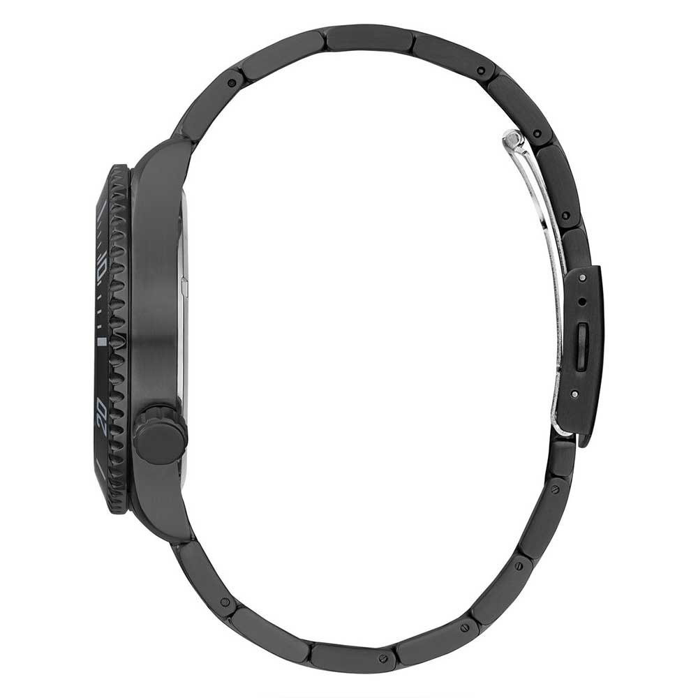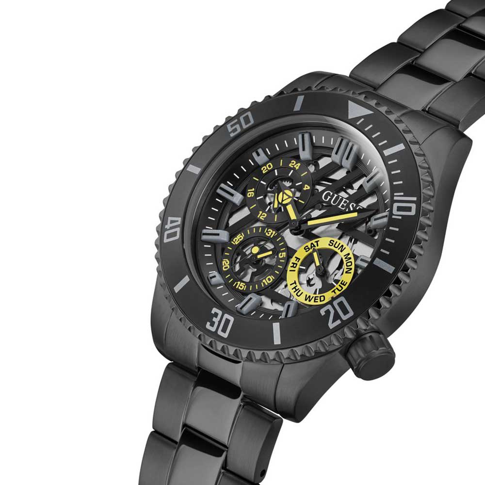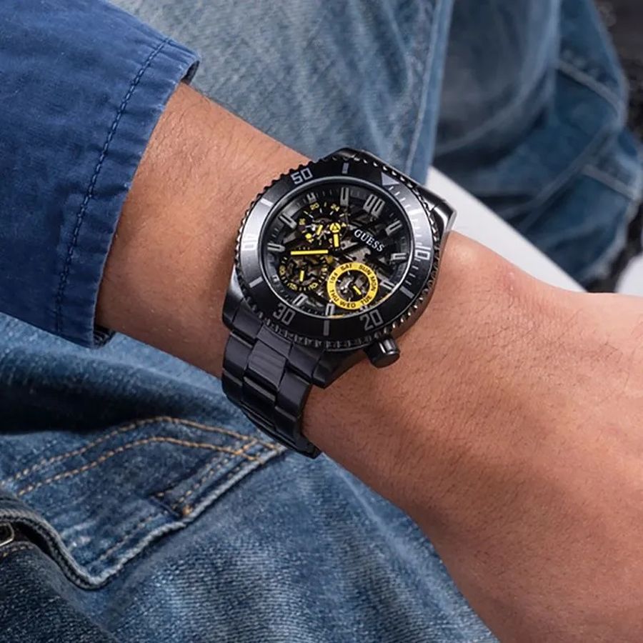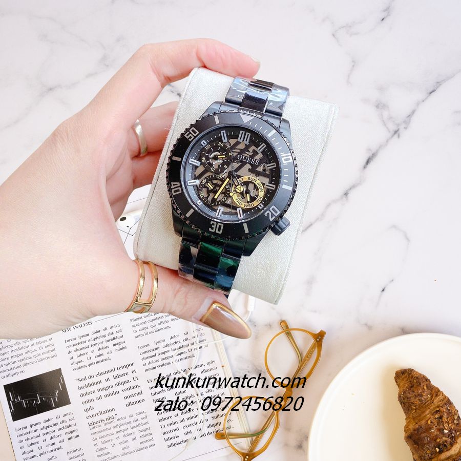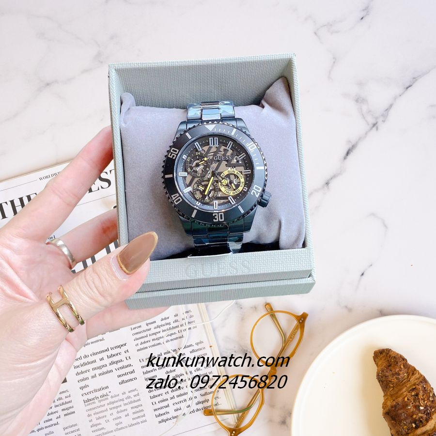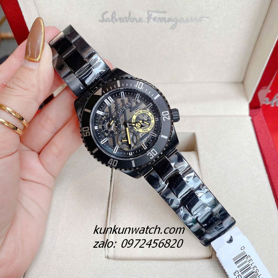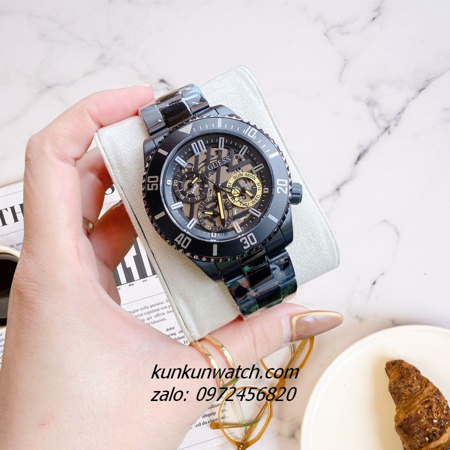 ◾ Đồng Hồ Nam Guess Axle GW0488G3 tông Full đen có vỏ răng cưa, đánh dấu phút vành ngoài kết hợp nền mặt số lộ máy mạnh mẽ, nam tính. Núm chỉnh giờ phá cách