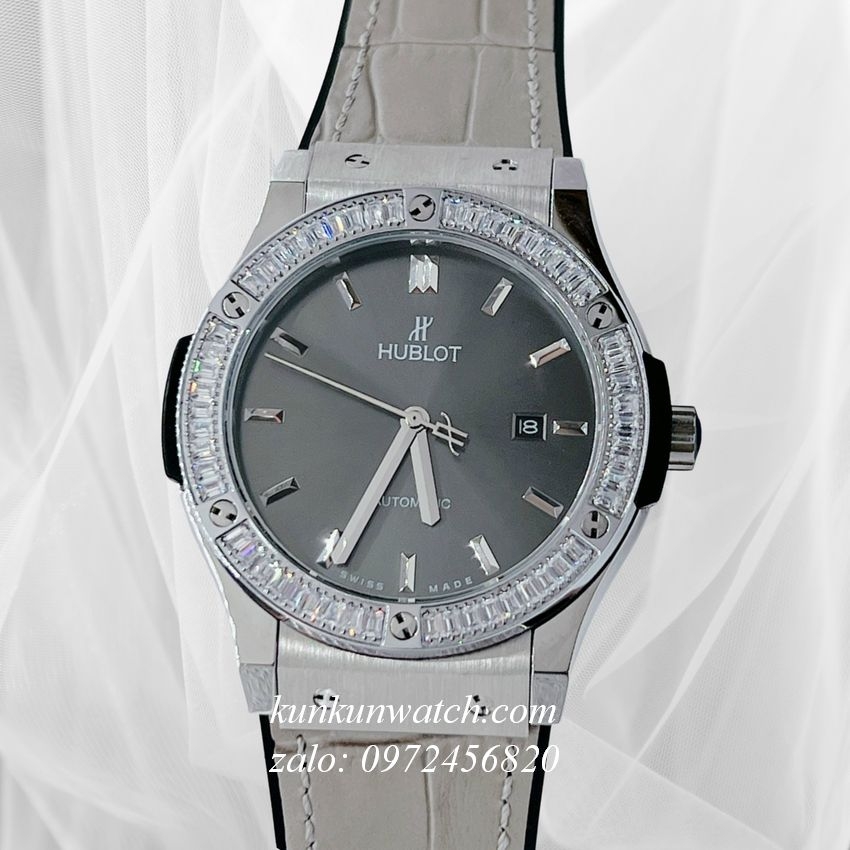 Đồng Hồ Nam Hublot Automatic đính viền đá pha lê vuông. Dây da silicone khoá bướm chống gập gãy.