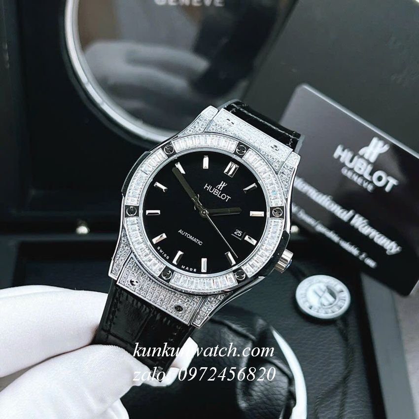 Đồng Hồ Nam Hublot Automatic đính viền đá pha lê vuông Full vỏ. Dây da vân silicone khoá bướm chống gập gãy.