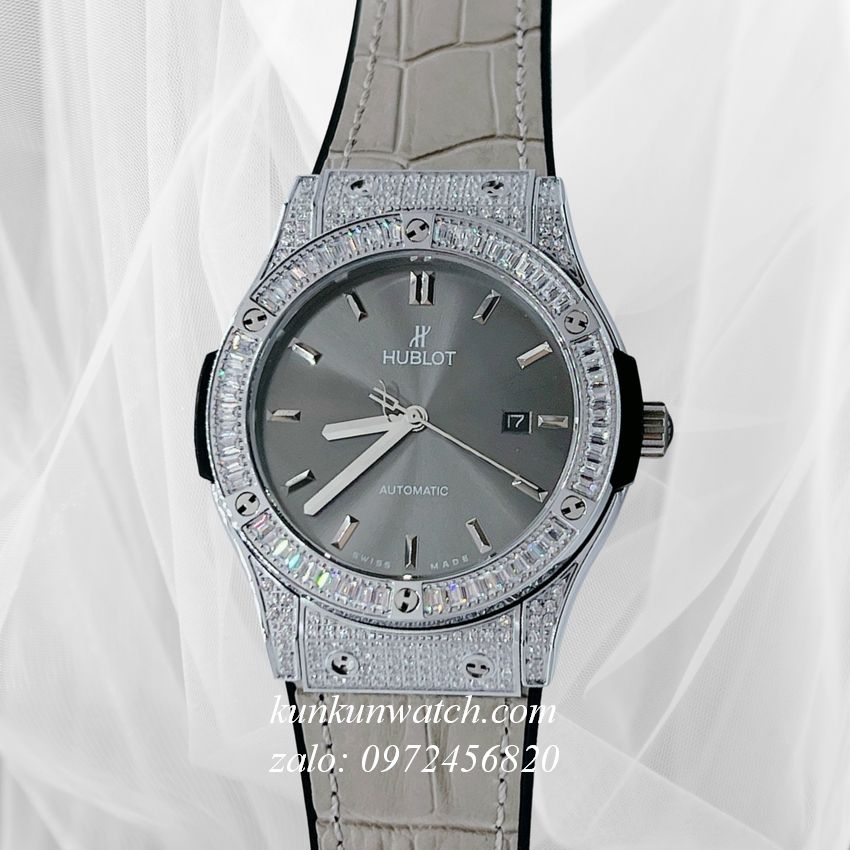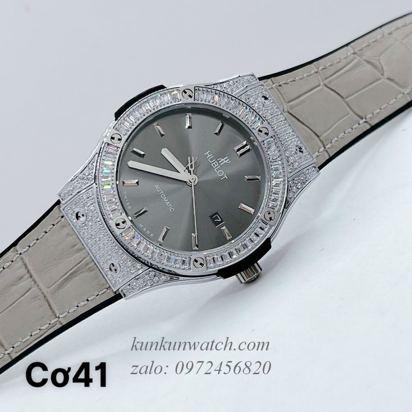 Đồng Hồ Nam Hublot Automatic đính viền đá pha lê vuông Full vỏ. Dây da vân silicone khoá bướm chống gập gãy.