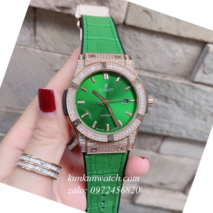 Đồng Hồ Nam Hublot Automatic đính viền đá pha lê vuông Full vỏ. Dây da vân silicone khoá bướm chống gập gãy.