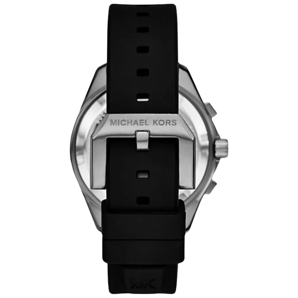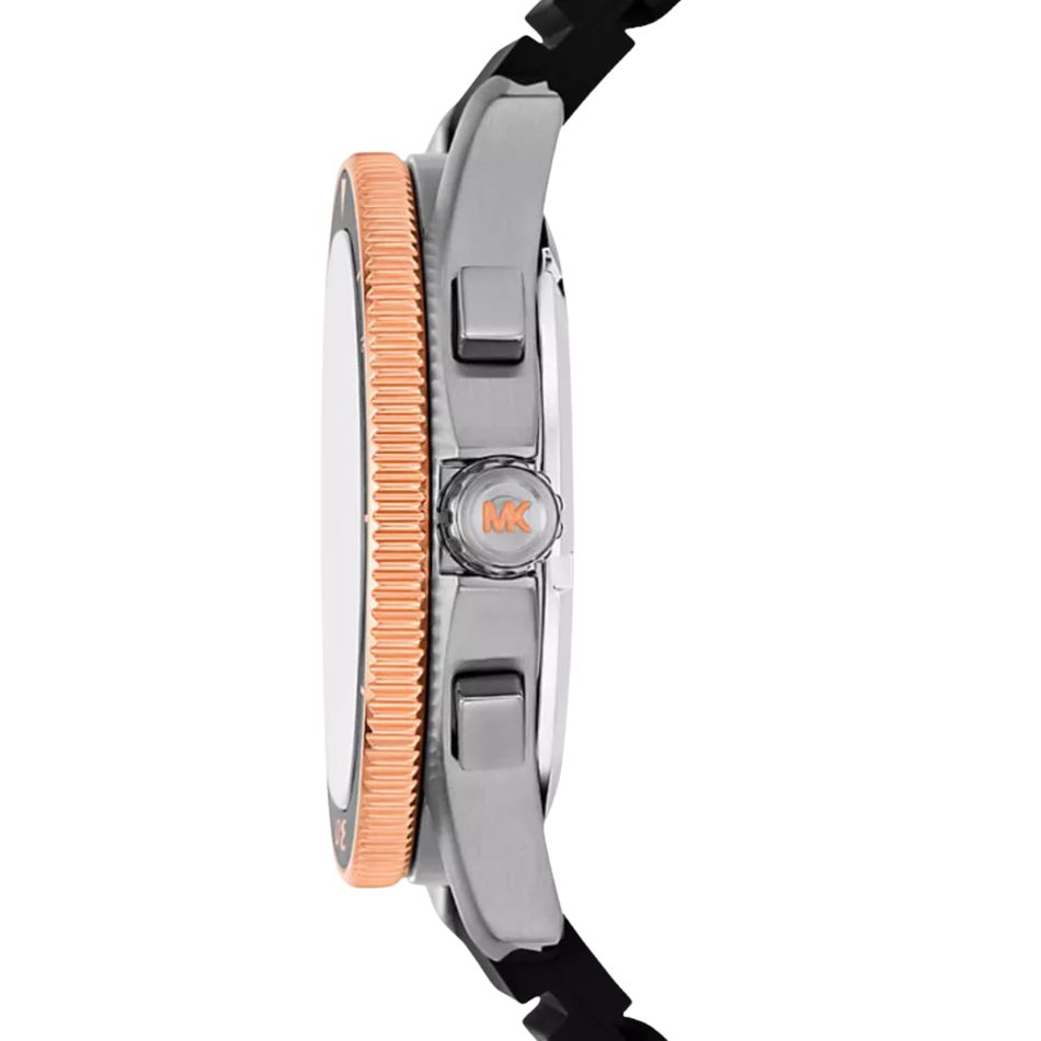 ◼️ Đồng Hồ Nam Michael Kors Maritime MK9206 sử dụng tông full đen, silver mạnh mẽ. Kim, chấm giờ dạ quang, kim giây nổi bật. Vòng bezel họa tiết răng cưa, điểm số. Dây silicone đen dáng rãnh ngang, phong cách thể thao, siêu bền