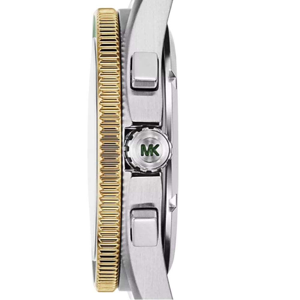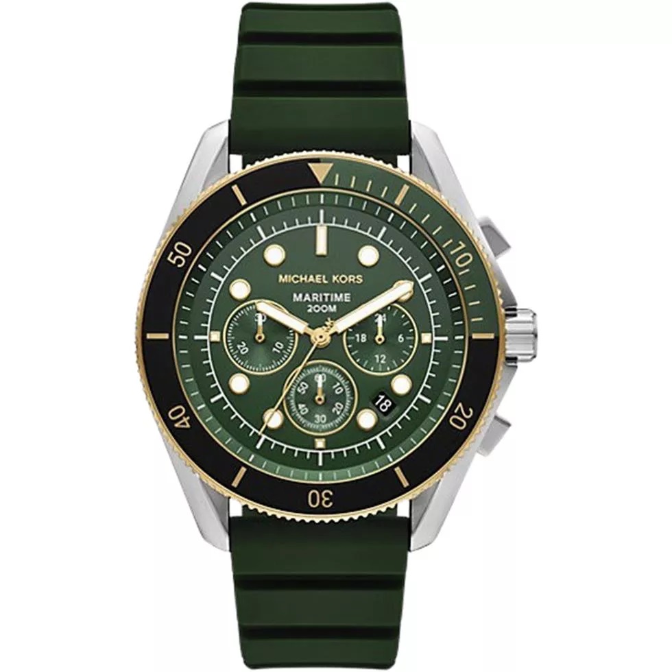 ◼️ Đồng Hồ Nam Michael Kors Maritime MK9205 sử dụng tông full xanh rêu, demi nam tính. Kim, chấm giờ dạ quang, kim giây nổi bật. Vòng bezel họa tiết răng cưa, điểm số. Dây silicone xanh dáng rãnh ngang, phong cách thể thao, siêu bền