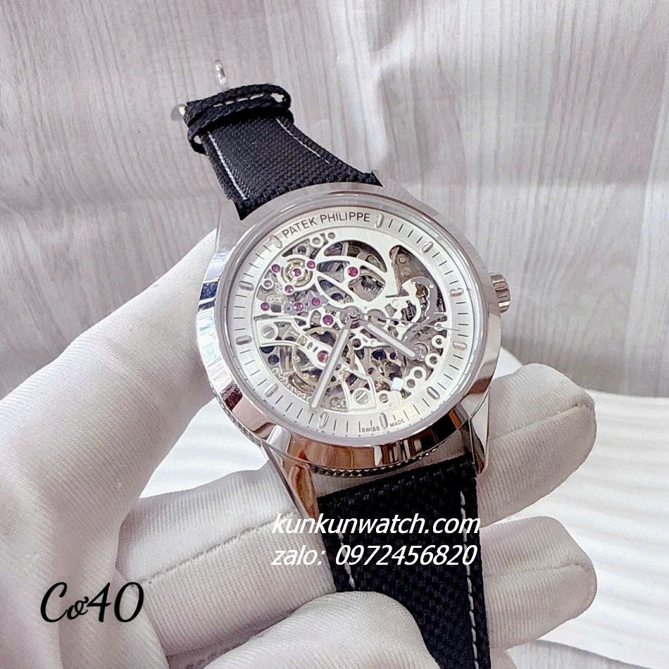 Đồng Hồ Nam Patek Philippe automatic lộ cơ mạnh mẽ. 3 kim hoạt động. Điểm vạch các mốc giờ.  Dây đeo đường chỉ may chắc chắn ( khóa gài )
