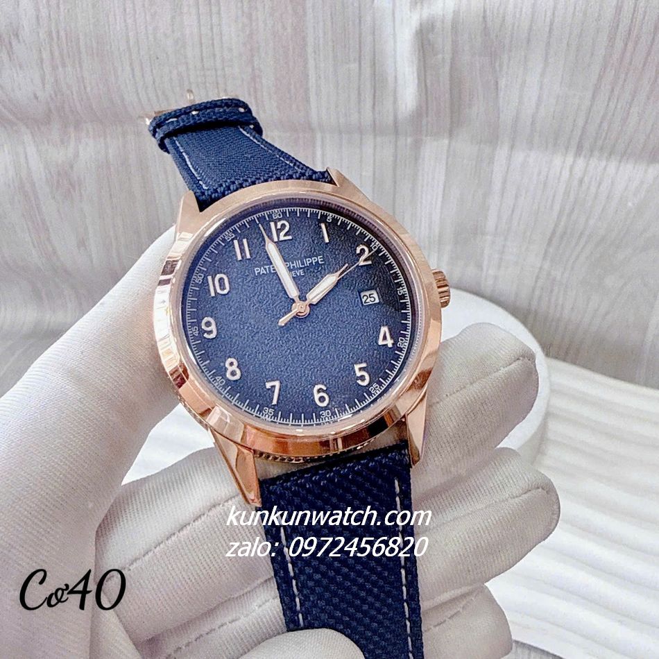 Đồng Hồ Nam Patek Philippe Geneve Automatic Nền Mặt Vân Cát Dây Da Xanh Rose Gold 40mm