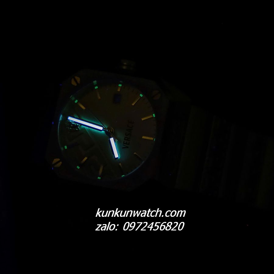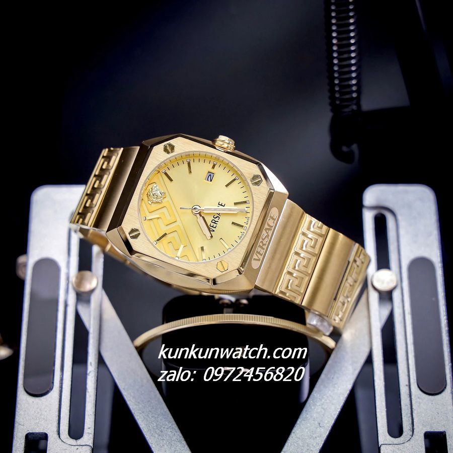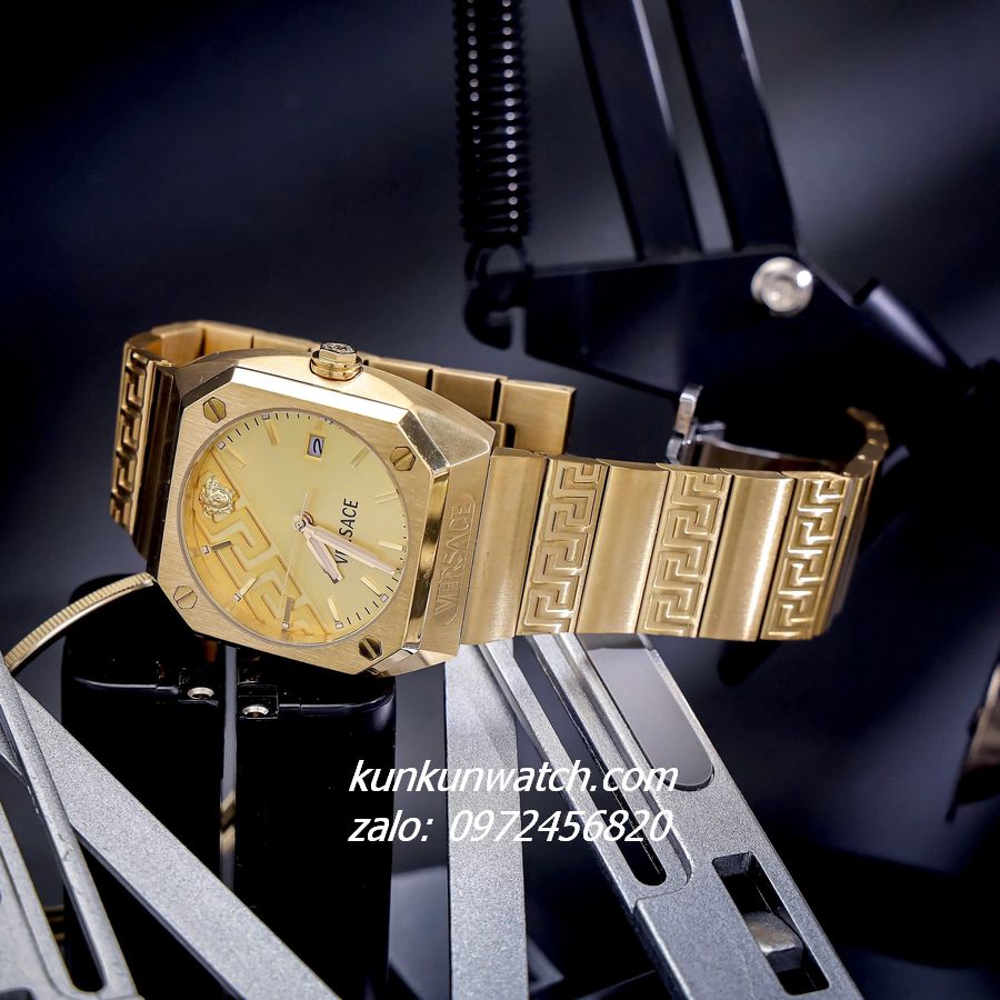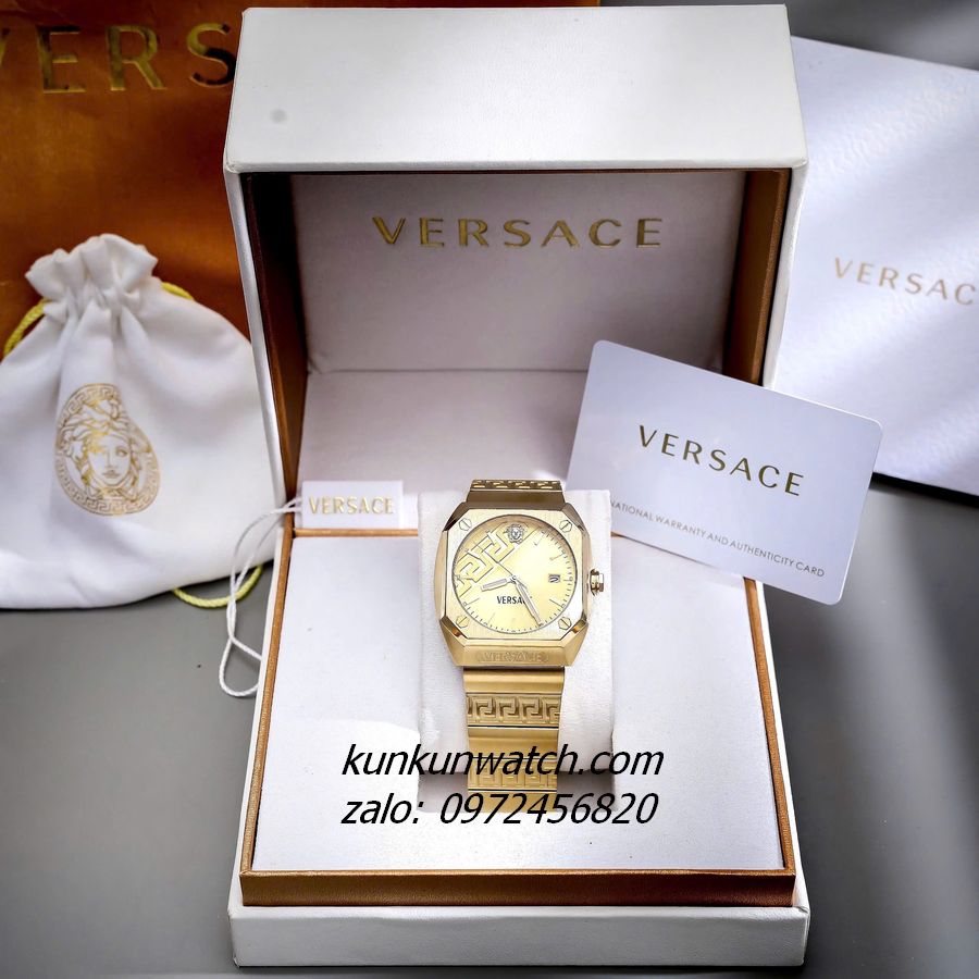 Đồng Hồ Nam Versace Antares Gold mặt vuông, điểm vạch 11 mốc giờ, icon medusa mốc 12 giờ. Họa tiết Greca ở nền mặt số và dây đeo cực chất. Dây đeo thép không rỉ, khóa bấm