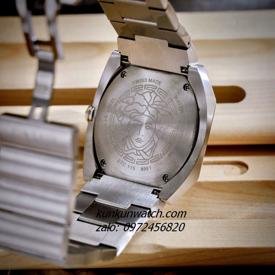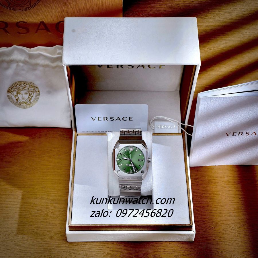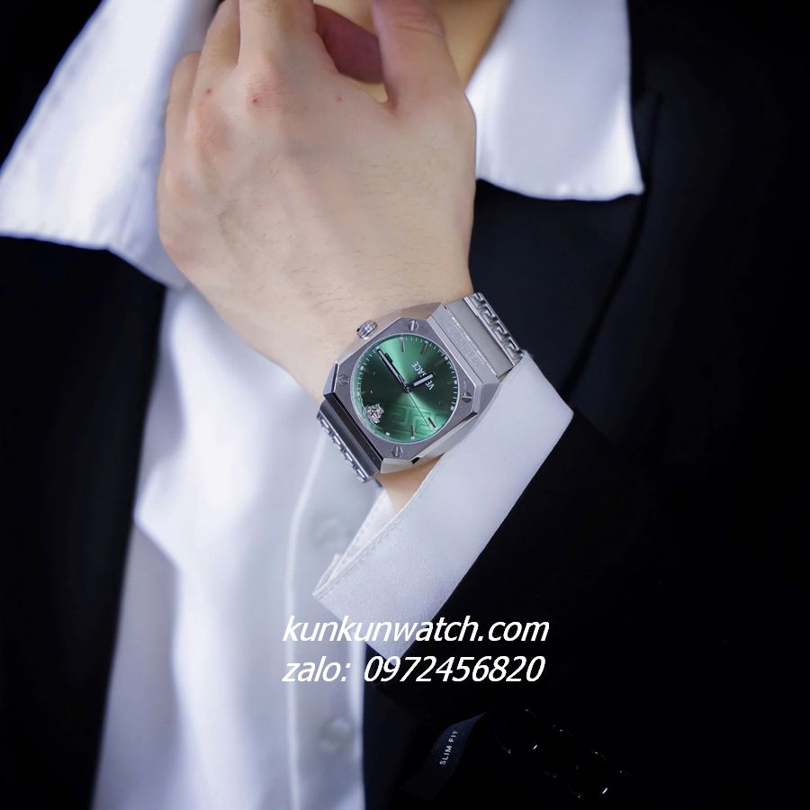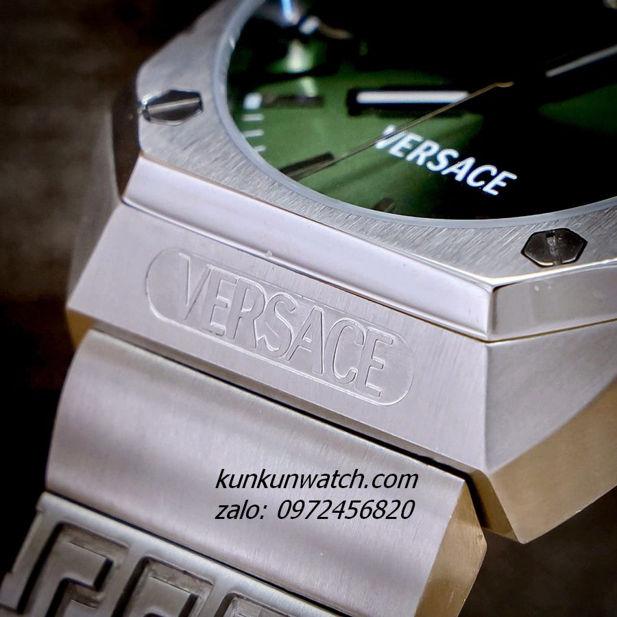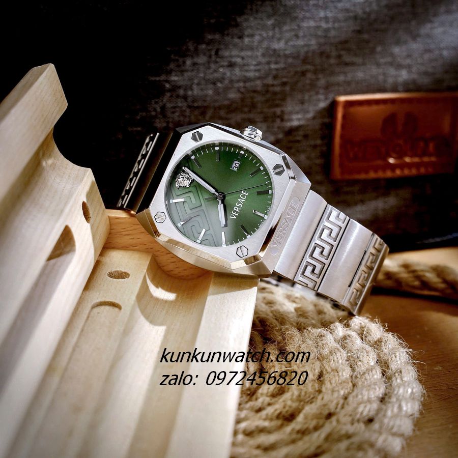 Đồng Hồ Nam Versace Antares Green Silver mặt vuông, điểm vạch 11 mốc giờ, icon medusa mốc 12 giờ. Họa tiết Greca ở nền mặt số và dây đeo cực chất. Dây đeo thép không rỉ, khóa bấm