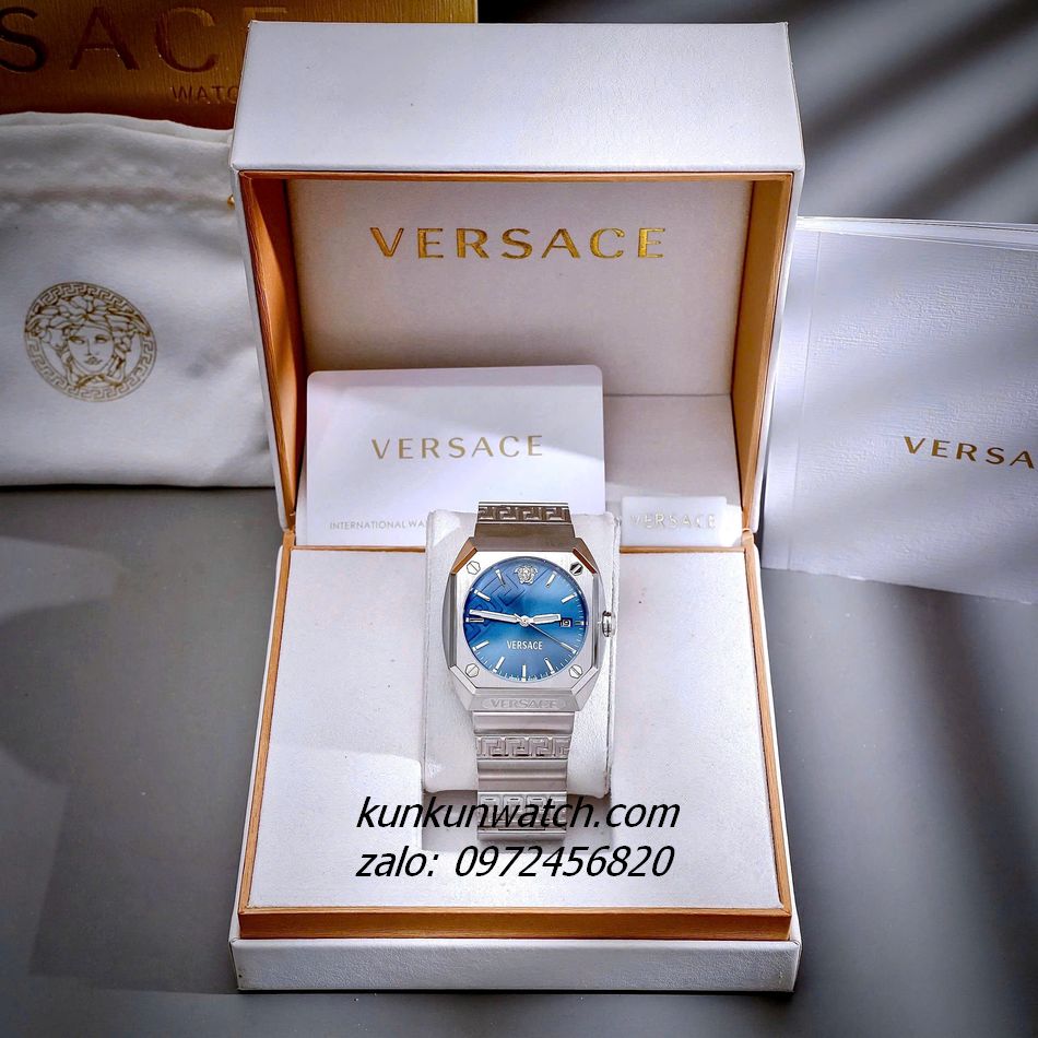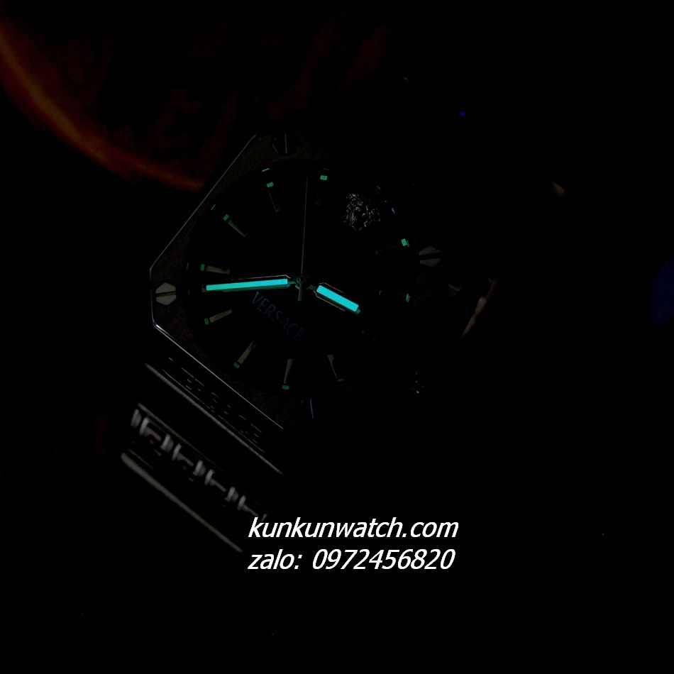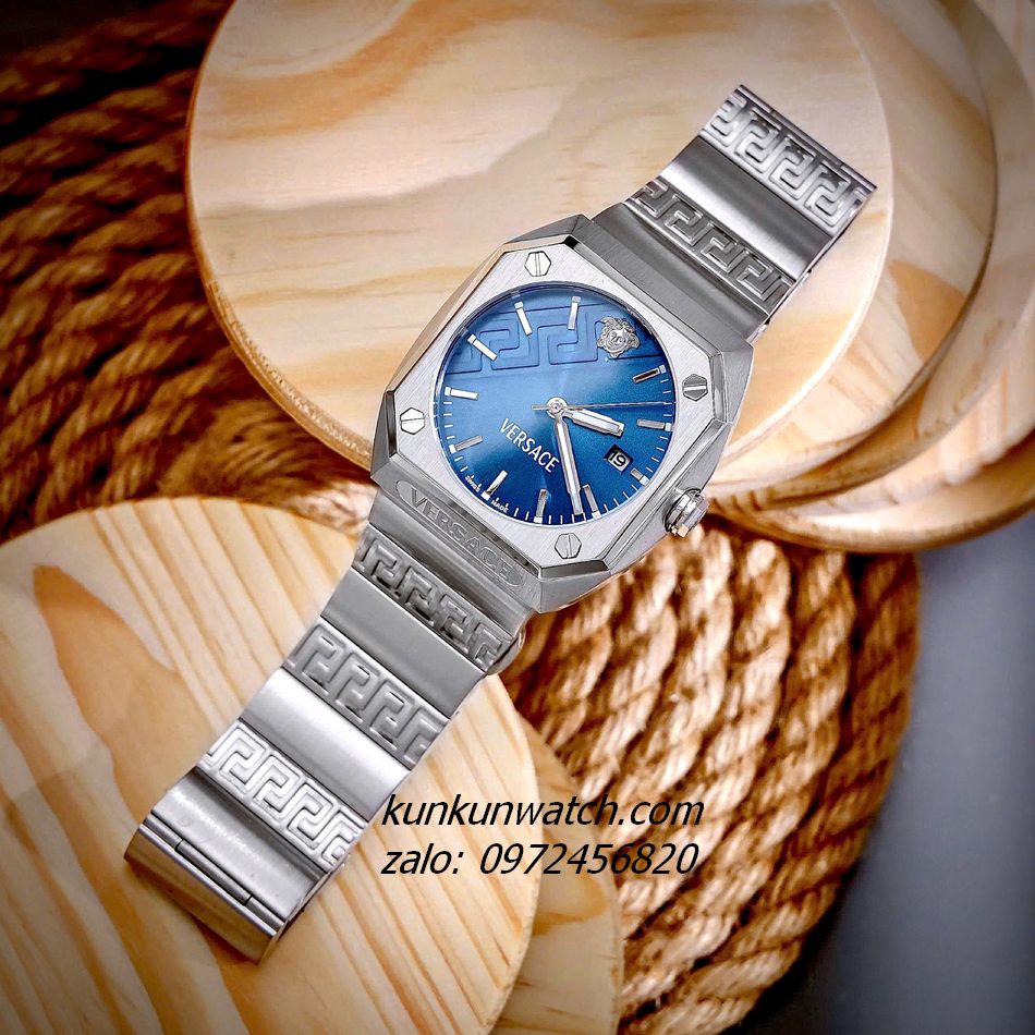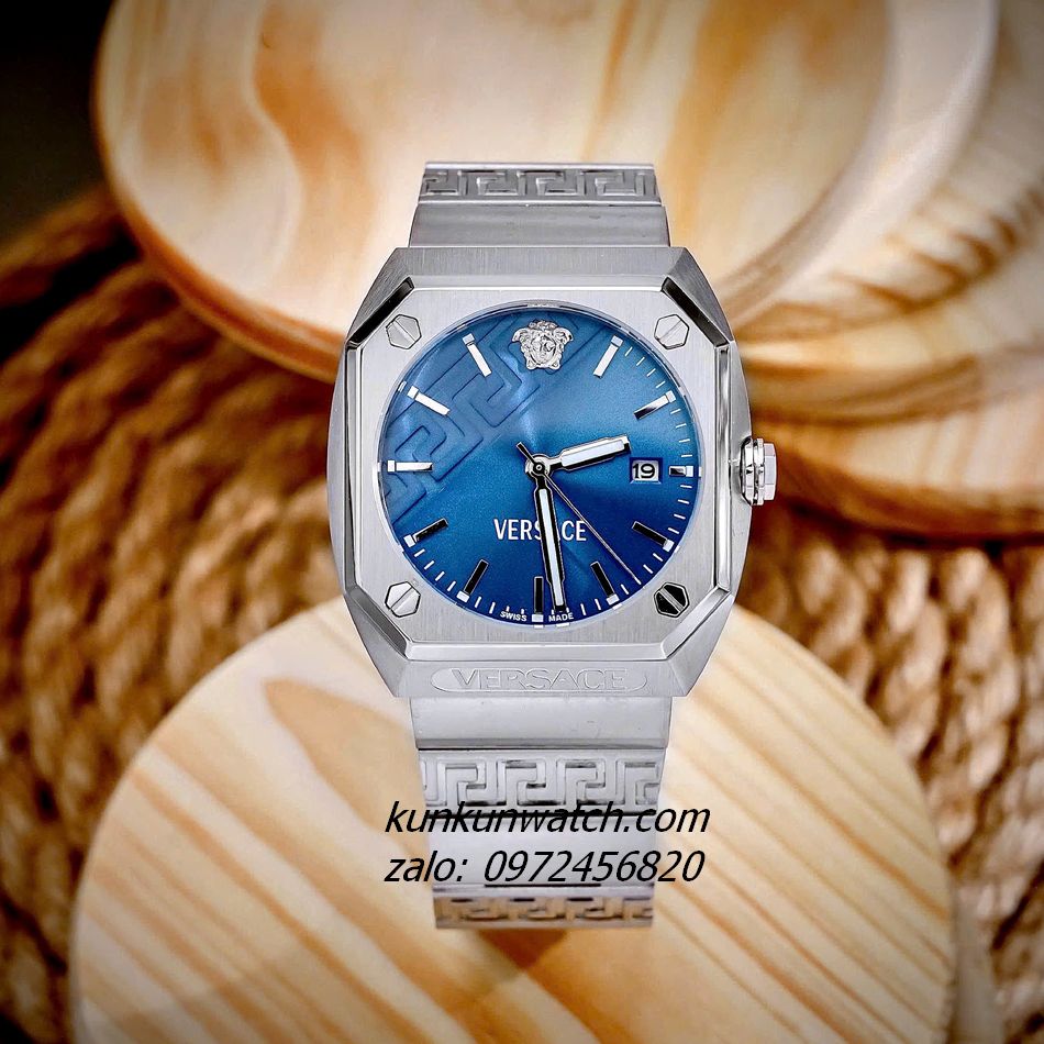 Đồng Hồ Nam Versace Antares Green Silver mặt vuông, điểm vạch 11 mốc giờ, icon medusa mốc 12 giờ. Họa tiết Greca ở nền mặt số và dây đeo cực chất. Dây đeo thép không rỉ, khóa bấm