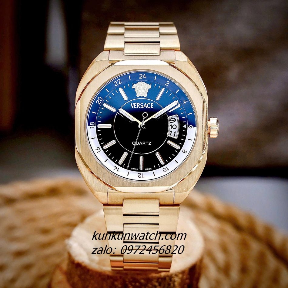 Đồng Hồ Nam Versace V-Contempo thiết kế mặt số vuông bo tròn độc đáo, ấn tượng. Lịch ngày phá cách. Điểm số 24 giờ, logo medusa mốc 12 giờ. 3 kim hoạt động