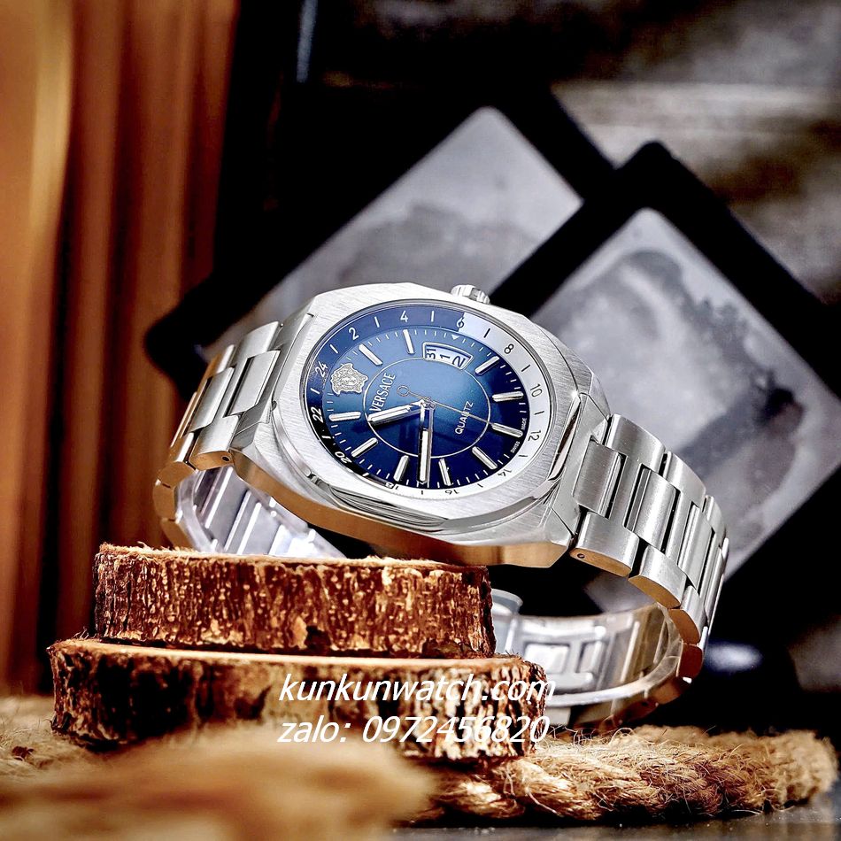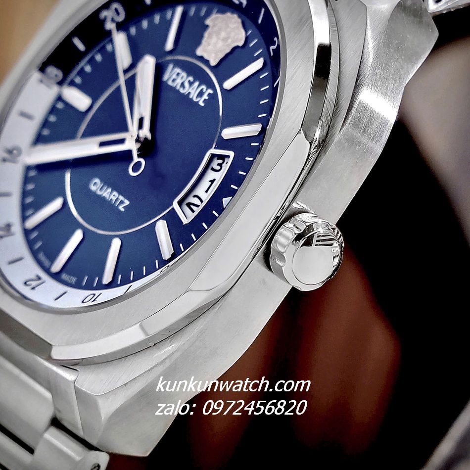 Đồng Hồ Nam Versace V-Contempo thiết kế mặt số vuông bo tròn độc đáo, ấn tượng. Lịch ngày phá cách. Điểm số 24 giờ, logo medusa mốc 12 giờ. 3 kim hoạt động