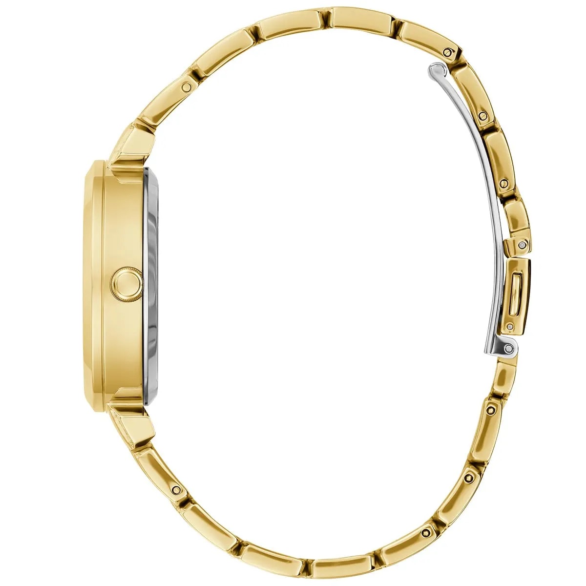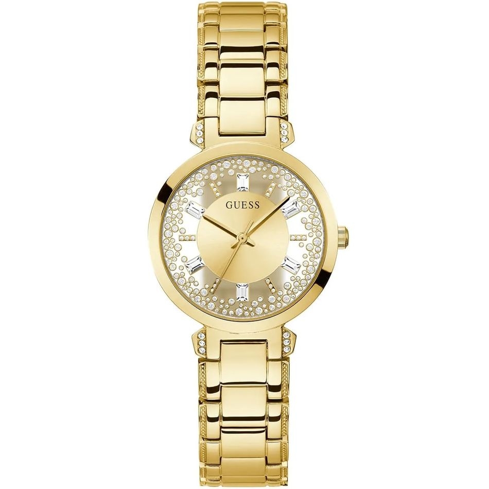 ✔️ Đồng Hồ Nữ Guess GW0470L2 được đính đá phá cách trên nền mặt số trong suốt, điểm pha lê 12 mốc giờ, 3 kim hoạt động. Dây đeo thép không rỉ khóa bấm thương hiệu