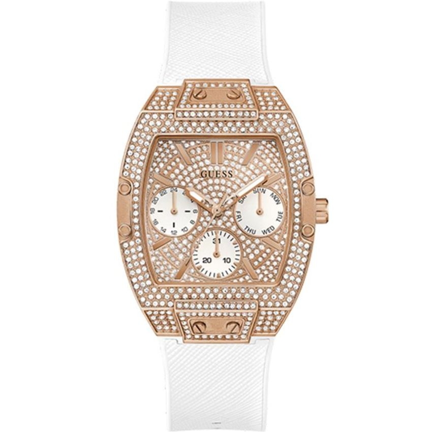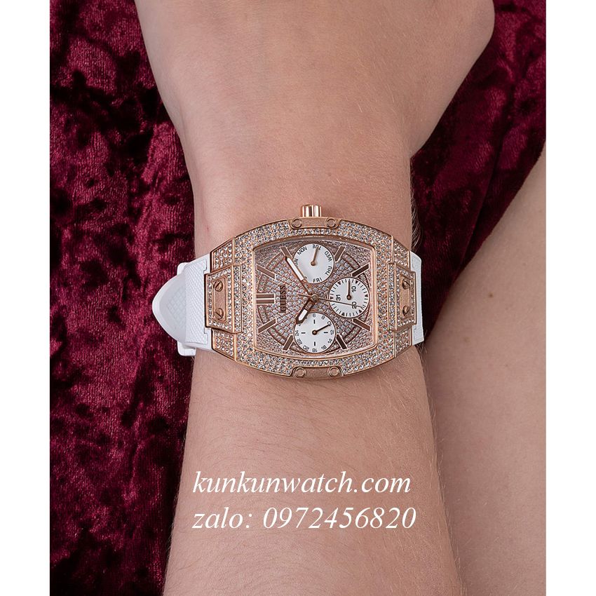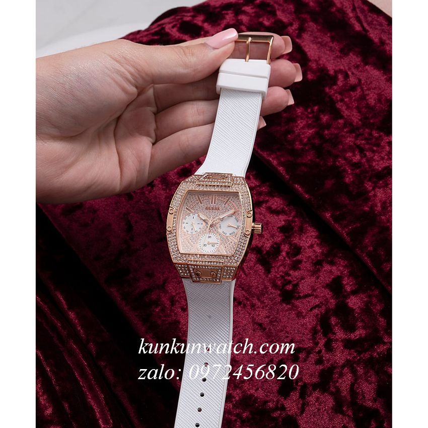 ✔️ Đồng Hồ Nữ Guess GW0105L3 phiên bản Franck Muller đính Full pha lê. 3 mặt số phụ thể hiện lịch thứ, ngày và 24 giờ. Dây Silicone bọc da kim tuyến lấp lánh, sang trọng