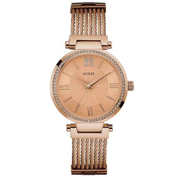 ✔️ Đồng Hồ Nữ Guess W0638L4 được đính viền pha lê, tạo điểm nhấn bằng số la mã tại các mốc 3H - 6H - 9H -12H cổ điển