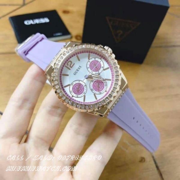 ✔️ Đồng Hồ Nữ Guess W0846L5 có kim chỉ, vạch số giờ và vỏ tông vàng hồng nhẹ nhàng, nữ tính. Mặt số đính pha lê phá cách, kiểu dáng hublot cá tính