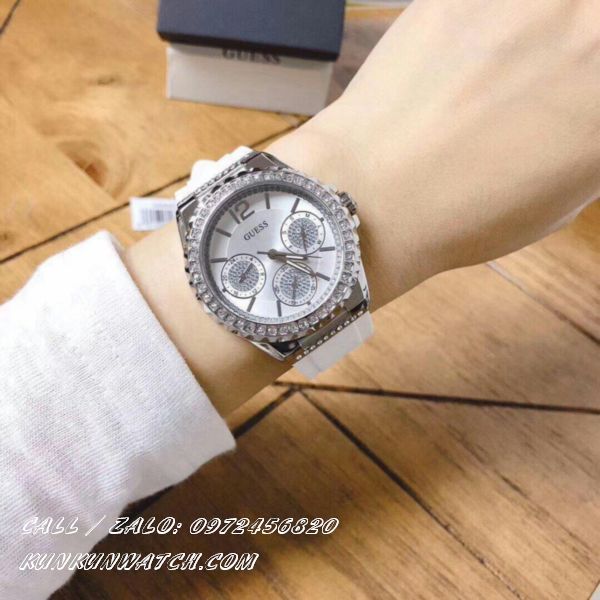✔️ Đồng Hồ Nữ Guess W0846L8 sử dụng tông Full trắng sang trọng. Mặt số đính pha lê phá cách, kiểu dáng hublot cá tính