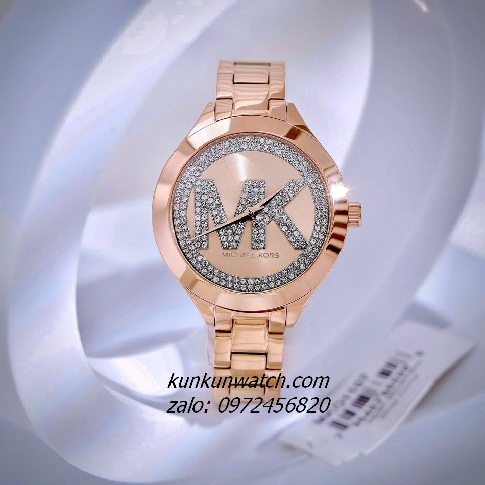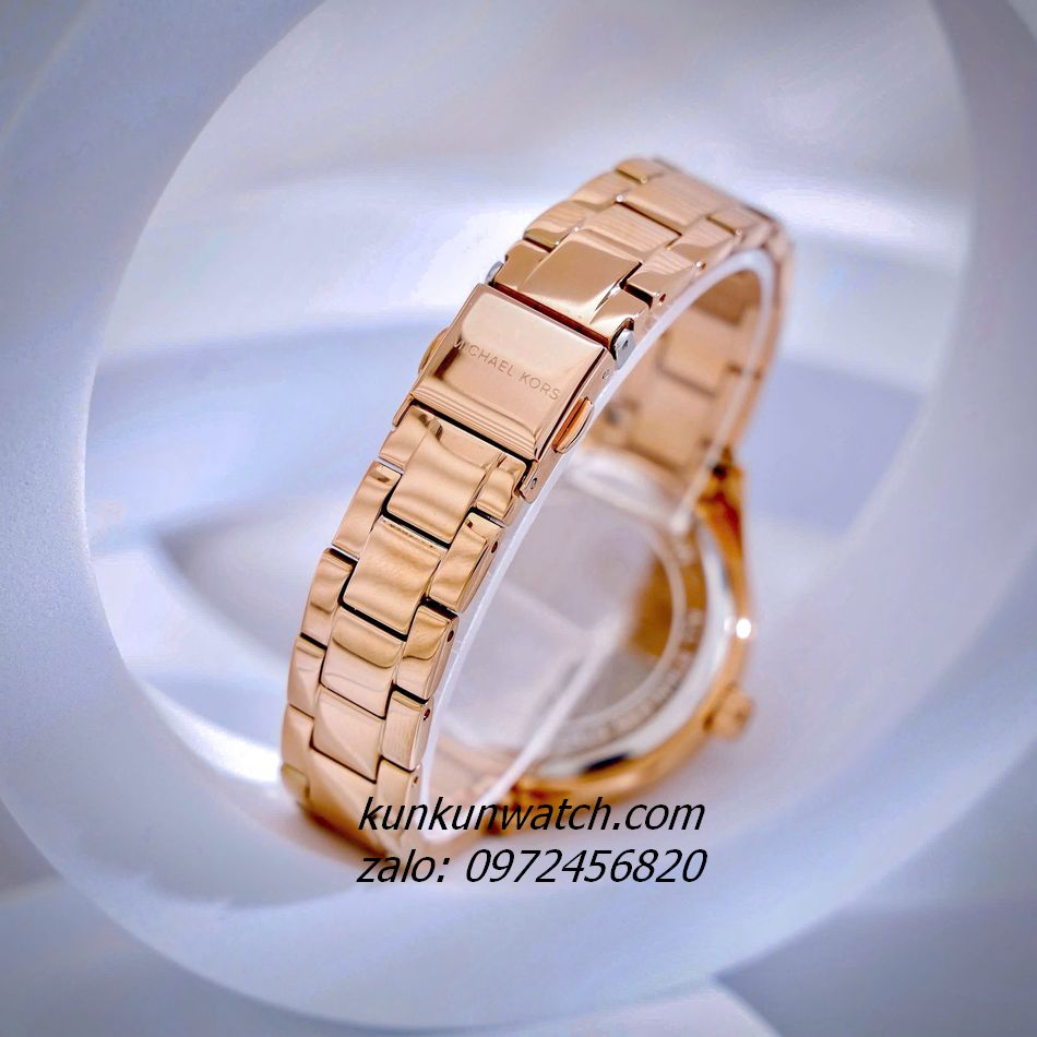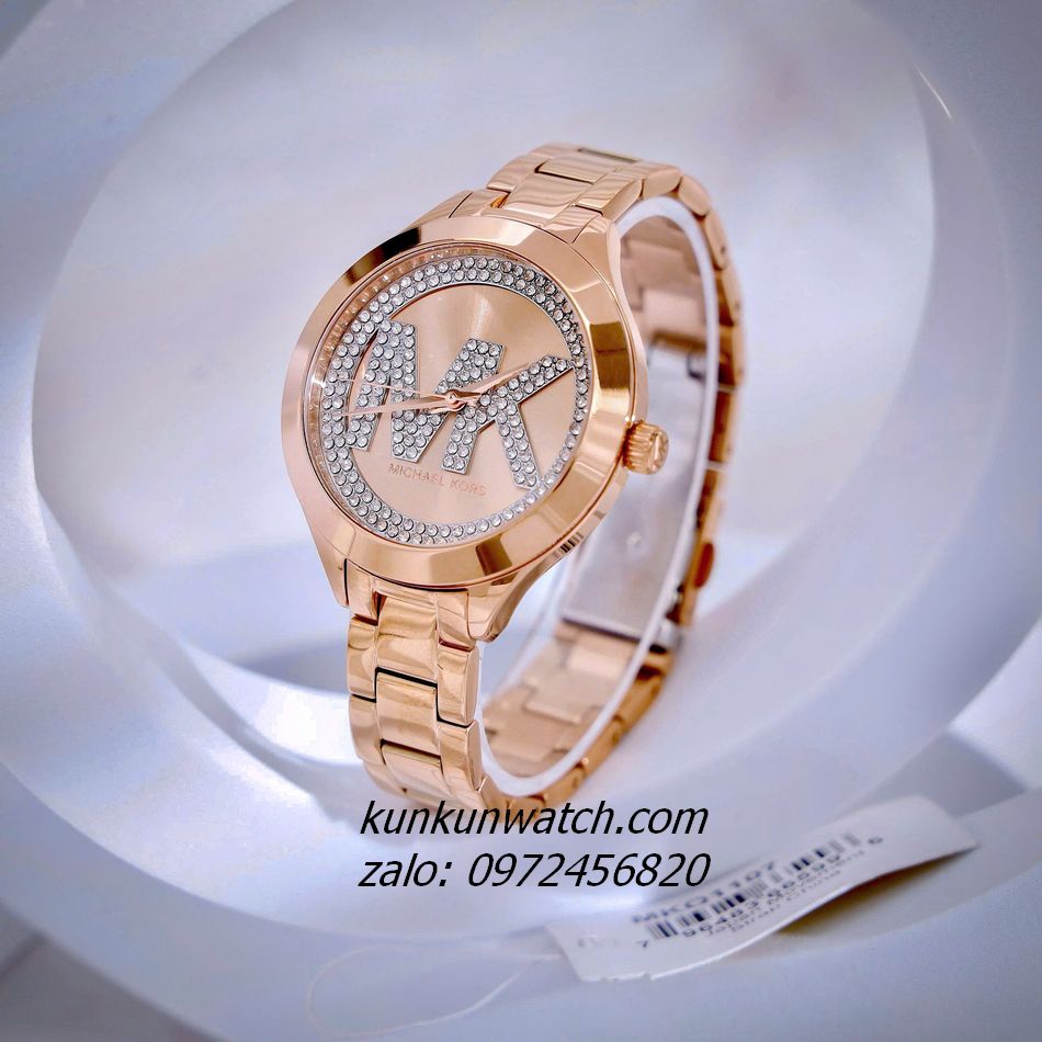◾ Đồng Hồ Nữ Michael Kors Aspyn MKO1107 thiết kế tông Rose Gold, đính đá 2 vòng nền mặt số cùng họa tiết MK nổi bật. 3 kim hoạt động