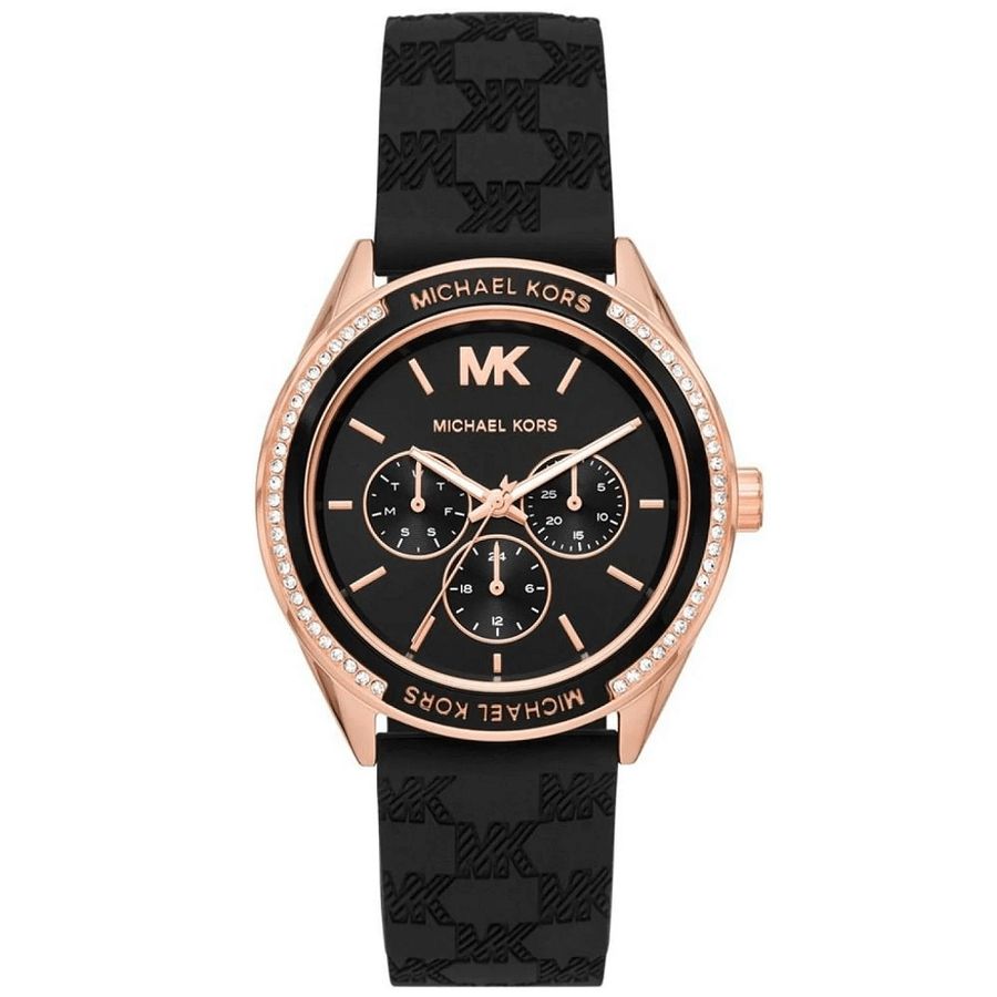 ◾ Đồng Hồ Nữ Michael Kors MK7266 có vỏ đính viền đá phối khắc tên thương hiệu đối xứng. Ba mặt số phụ, 6 kim hoạt động