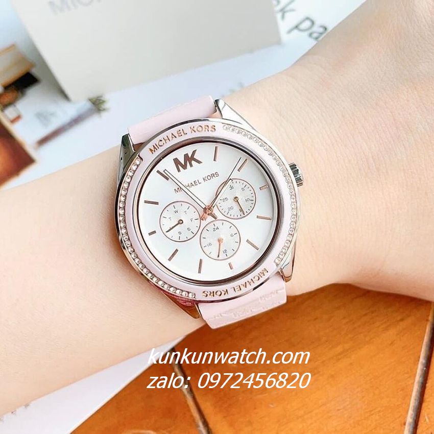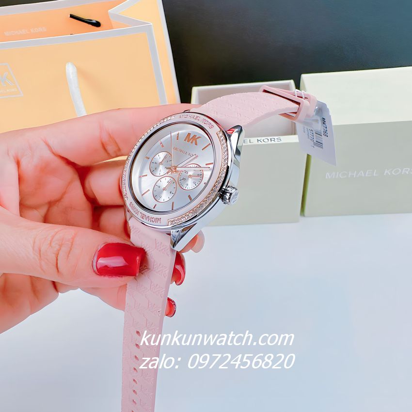 ◾ Đồng Hồ Nữ Michael Kors MK7268 có vỏ đính viền đá phối khắc tên thương hiệu đối xứng. Ba mặt số phụ, 6 kim hoạt động