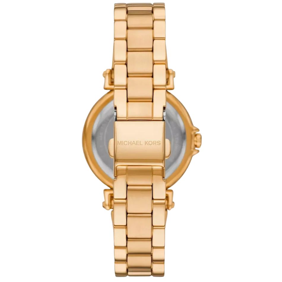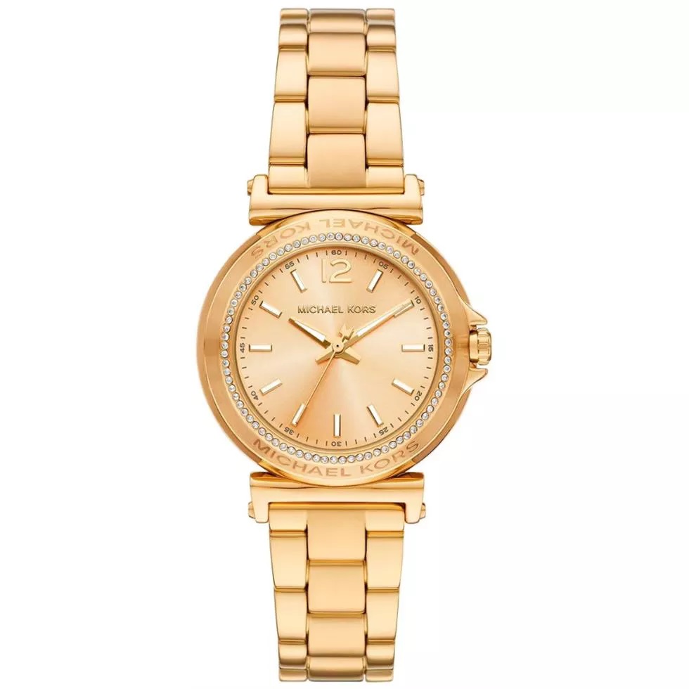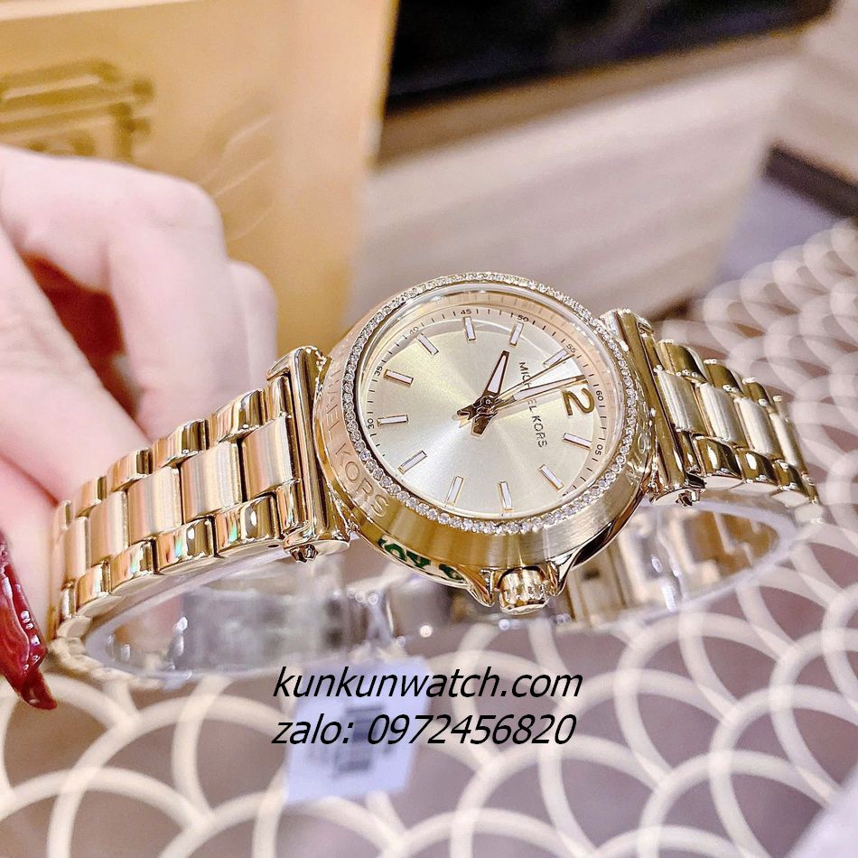 ◾ Chiếc Đồng Hồ Nữ Michael Kors Maren MK7516 với vỏ tông vàng viền khắc tên thương hiệu đối xứng phối đính đá tạo điểm nhấn. Đánh dấu phút 12 mốc giờ