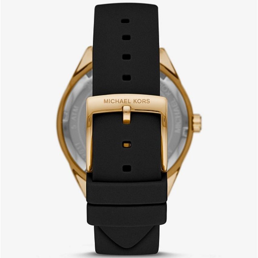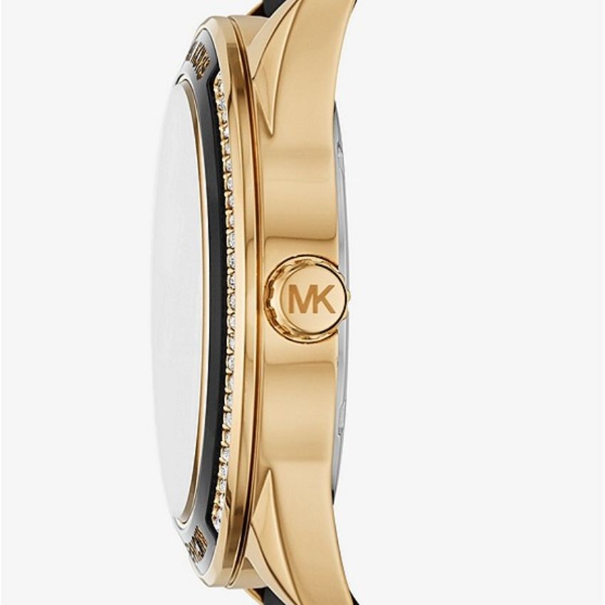 ◾ Đồng Hồ Nữ Michael Kors MK6944 có vỏ đính viền đá phối khắc tên thương hiệu đối xứng. Ba mặt số phụ đính full đá, 6 kim hoạt động, điểm vạch các mốc giờ