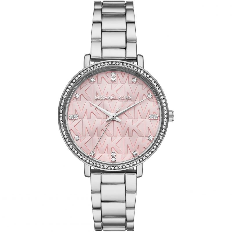 ◾ Đồng Hồ Nữ Michael Kors Pyper MK4631 thiết kế độc đáo, ấn tượng với nền mặt số tông hồng họa tiết MK phối đính đá 12 mốc giờ. Dây, vỏ thép không rỉ