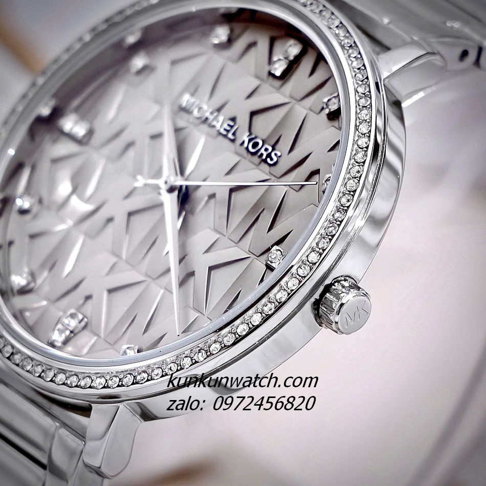 ◾ Đồng Hồ Nữ Michael Kors Pyper MK4672 thiết kế độc đáo, ấn tượng với nền mặt số họa tiết MK phối đính đá 12 mốc giờ. Dây, vỏ thép không rỉ