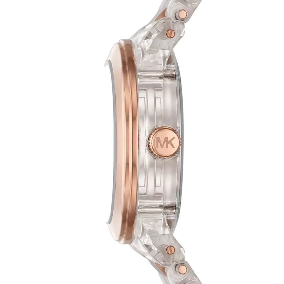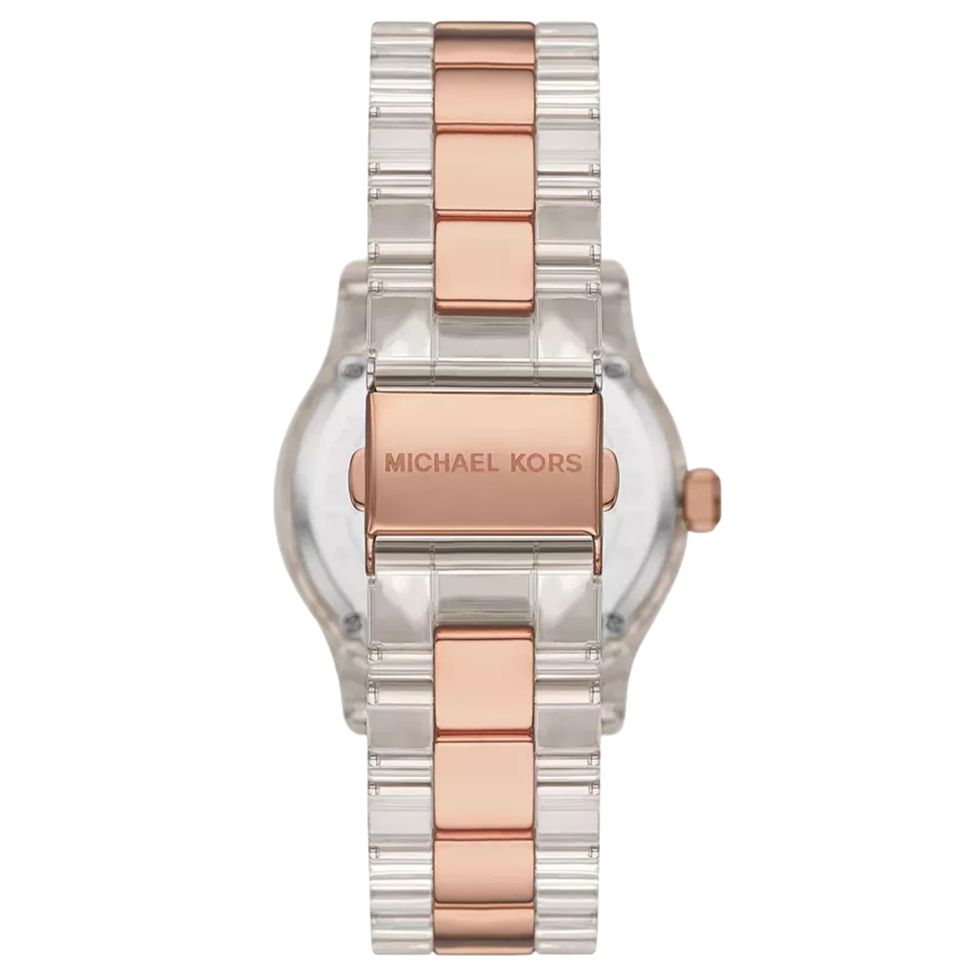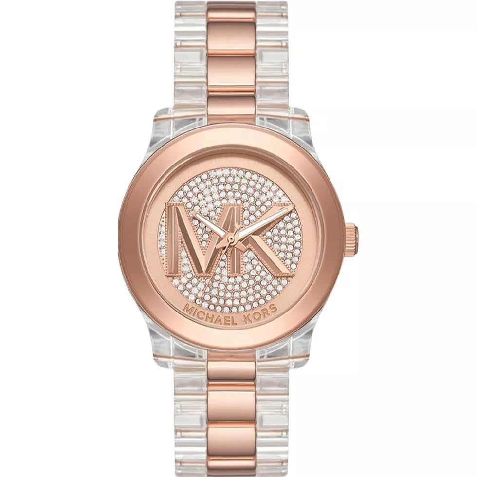 ◾ Đồng Hồ Nữ Michael Kors Runway MK7355 ấn tượng với nền mặt số đính đá, họa tiết MK. Tông rose gold nữ tính
