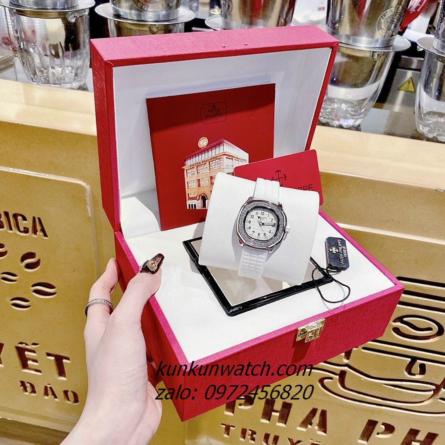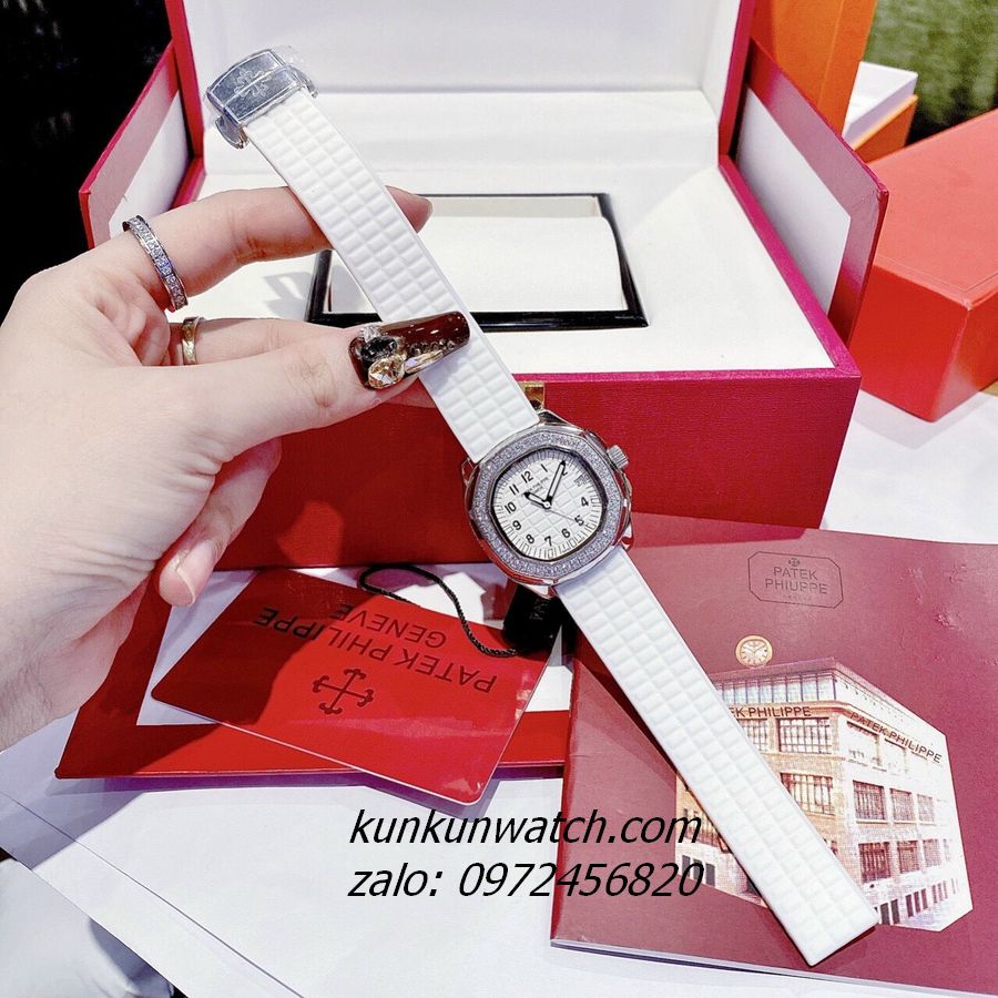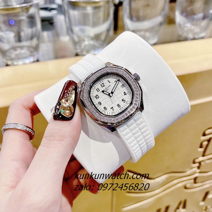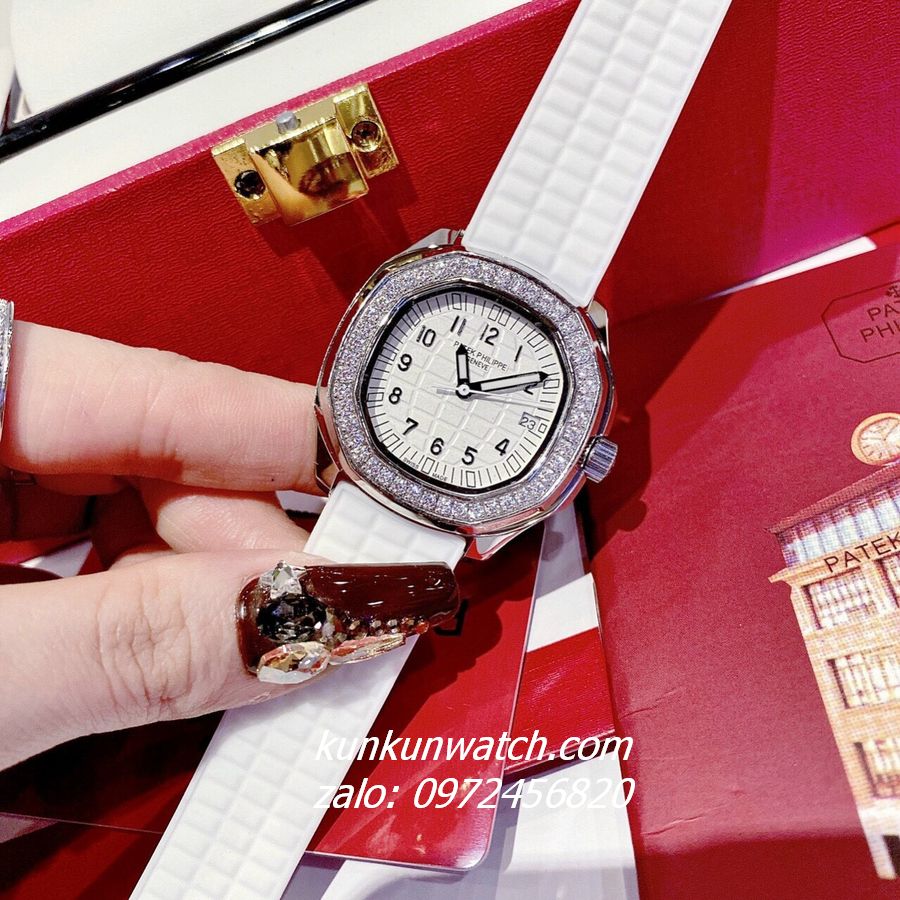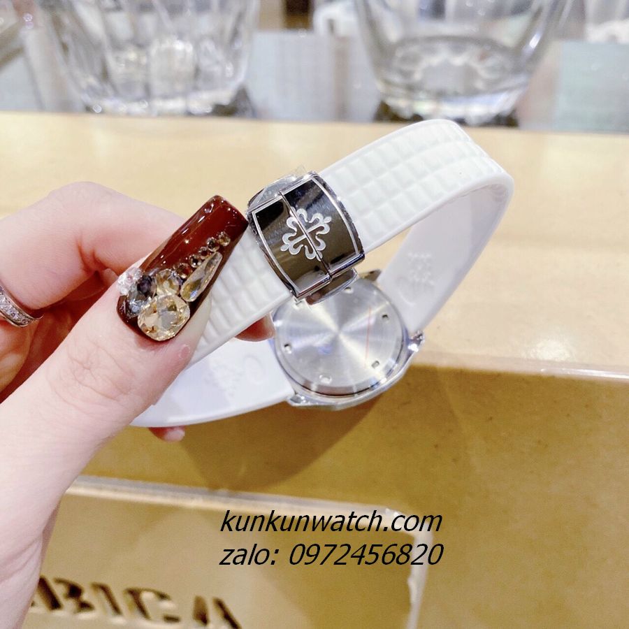 Đồng Hồ Nữ Patek Philippe Nautilus Đính Đá Silver Dây Silicone Trắng 36mm
