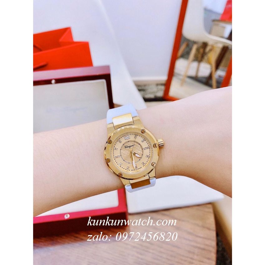Đồng Hồ Nữ Slavatore Ferragamo F80 có mặt số tròn case 33mm niềng trơn kết hợp 6 ốc vít - đính đá tại các mốc giờ - Dây đeo bằng cao su mềm mại, ôm tay, cá tính.