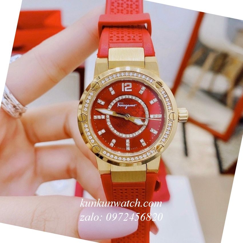 ◼️ Đồng Hồ Nữ Salvatore Ferragamo F80 đính viền đá pha nổi bật. Điểm số mốc 12 giờ kết hợp điểm pha lê các mốc giờ còn lại