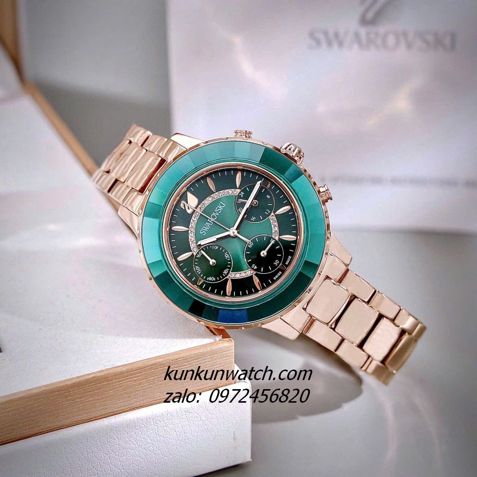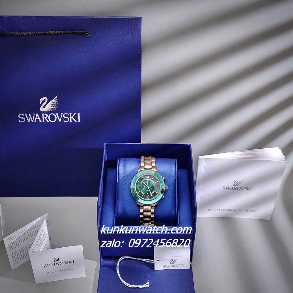 Đồng Hồ Nữ Swarovski Octea Lux Chrono thiết kế sang trọng vành xoay một chiều bằng tinh thể hematite Jet. Mặt đồng hồ đính đá swarovski lấp lánh. Logo thiên nga vị trí 12 giờ