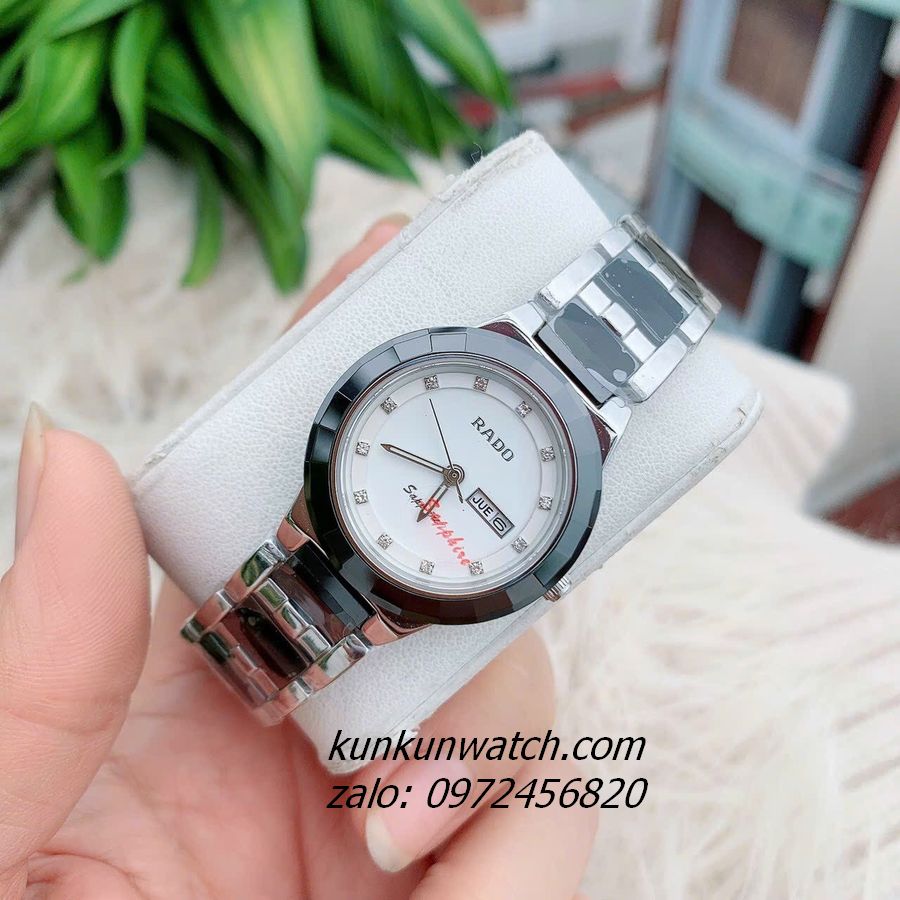 Đồng Hồ Cặp Đôi Rado mặt tròn thiết kế đính đá 12 mốc giờ, 2 lịch thứ ngày. Dây đá Ceramic đen silver sang trọng